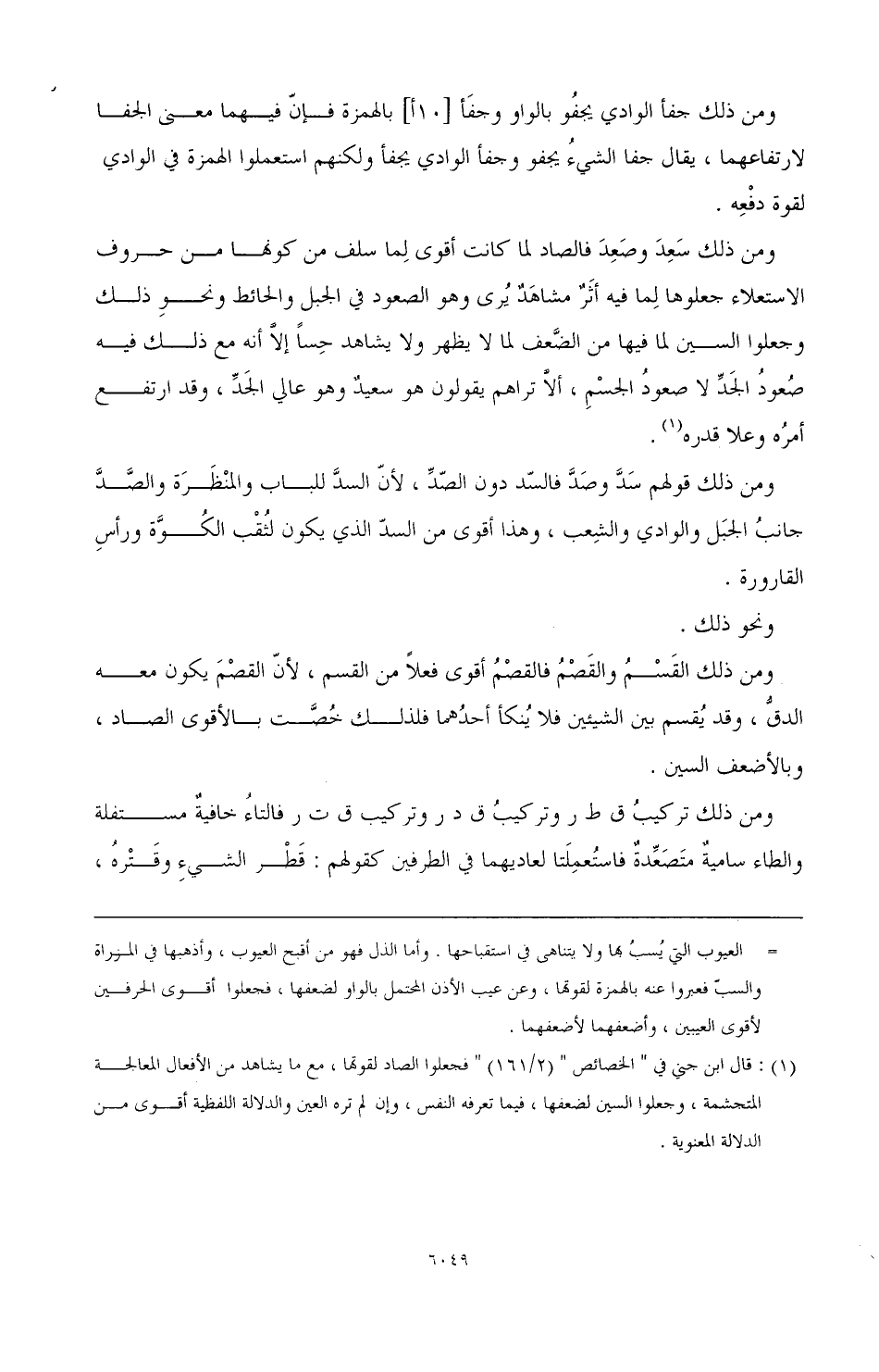 (¬1) قال ابن جني في (الخصائص) (2/ 161): (فجعلوا الصاد لقوتها، مع ما يشاهد من الأفعال المعالجة المتجشمة، وجعلوا السين لضعفها، فيما تعرفه النفس، وإن لم تره العين والدلالة اللفظية أقوى من الدلالة المعنوية.