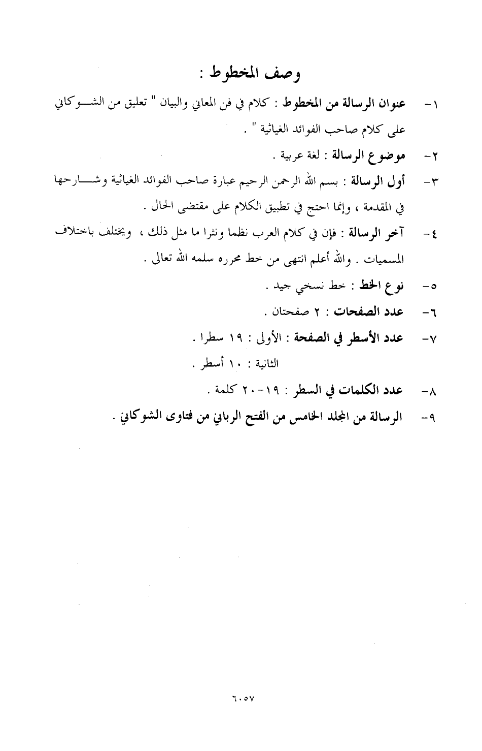 1 ـ عنوان الرسالة من المخطوط: كلام في فن المعاني (تعليق من الشوكاني على كلام صاحب الفوائد الغياثية).