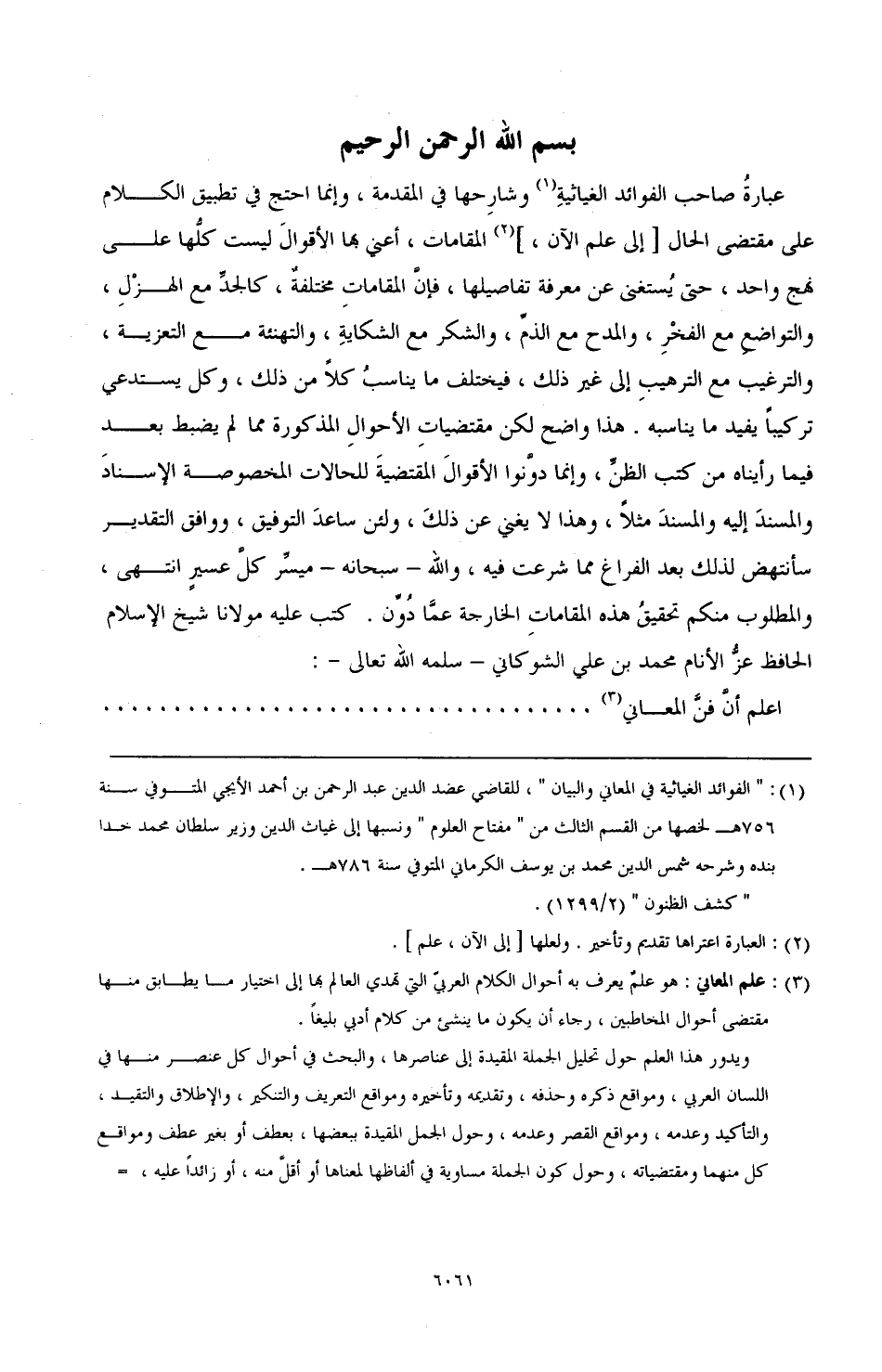 عبارةُ صاحب الفوائد الغياثيةِ (¬1) وشارِحها في المقدمة، وإنما احتج في تطبيق الكلام على مقتضي الحال [إلى علم الآن] (¬2) المقامات، أعني بها الأقوالَ ليست كلُّها على نهج واحد، حتى يُستغني عن معرفة تفاصيلها، فإنَّ المقاماتِ مختلفةٌ، كالجدِّ مع الهزْلِ، والتواضعِ مع الفخْرِ، والمدح مع الذّم، والشكر مع الشكايةِ، والتهنئة مع التعزية، والترغيب مع الترهيبِ إلى غير ذلكن فيختلف ما يناسبُ كلاًّ من ذلك، وكل يستدعي تركيبًا يفيد ما يناسبه. هذا واضح لكن مقتضياتِ الأحوالِ المذكورة مما لم يضبط بعد فيما رأيناه من كتب الظنِّ، وإنما دوَّنوا الأقوالَ المقتضيةَ للحالات المخصوصة الإسنادَ والمسندَ إليه والمسندَ مثلاً، وهذا لا يغني عن ذلكَ، ولئن ساعدَ التوفيق، ووافق التقدير سأنتهض لذلك بعد الفراغ مما شرعت فيه، والله ـ سبحانه ـ ميسِّر كلَّ عسيرٍ انتهى، والمطلوب منكم تحقيقُ هذه المقاماتِ الخارجة عمَّ دُوِّن. كتب عليه مولانا شيخ الإسلام الحافظ عزُّ الأنامِ محمد بن علي الشوكاني ـ سلمه الله تعالي ـ: