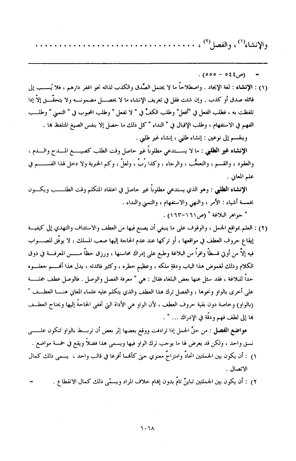 (¬2) العلم بمواقع الجمل, والوقوف على ما ينبغي أن يصنع فيها من العطف والاستئناف والتهدي إلى كيفية إيقاع حروف العطف في مواقعها, أو تركها عند عدم الحاجة إليها صعب المسلك, لا يوفَّق للصواب فيه إلاَّ من أوتي قسطًا وافرًا من البلاغة وطبع على إدراك محاسنها, ورزق حظًا من المعرفة في ذوق الكلام وذلك لغموض هذا الباب ودقة ملكه. وعظيم خطره, وكثير فائدته, يدل هذا أنهم جعلوه حدًا للبلاغة, فقد سئل عنها بعض البلغاء فقال: هى (معرفة الفصل والوصل. فالوصل عطف جملة على أخرى بالواو ونحوها, والفصل تركك هذا العطف والذي يتكلم عنه علماء المعاني هنا العطف (بالواو) وخاصة دون بقية حروف العطف, لأن الواو هى الأداة التي تخفى الحاجةُ إليها ويحتاج العطف بها إلى لطف فهم ودقّة في الإدراك ... ).