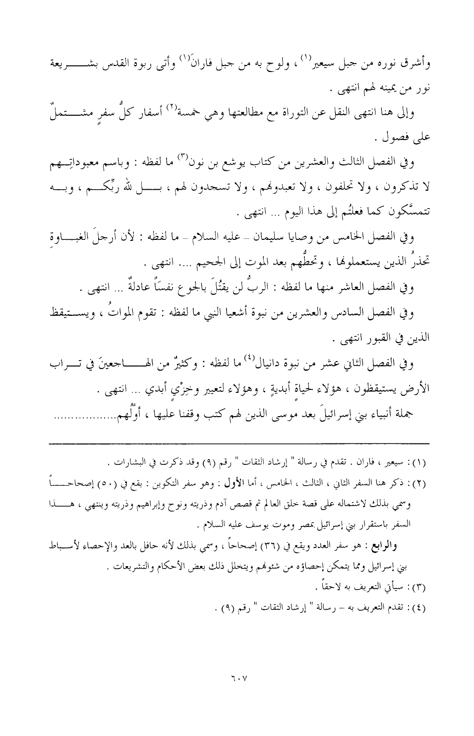 وإلى هنا انتهى النقل عن التوراة مع مطالعتها وهى خمسة (¬3) أسفار كل سفر مشتمل على فصول.
