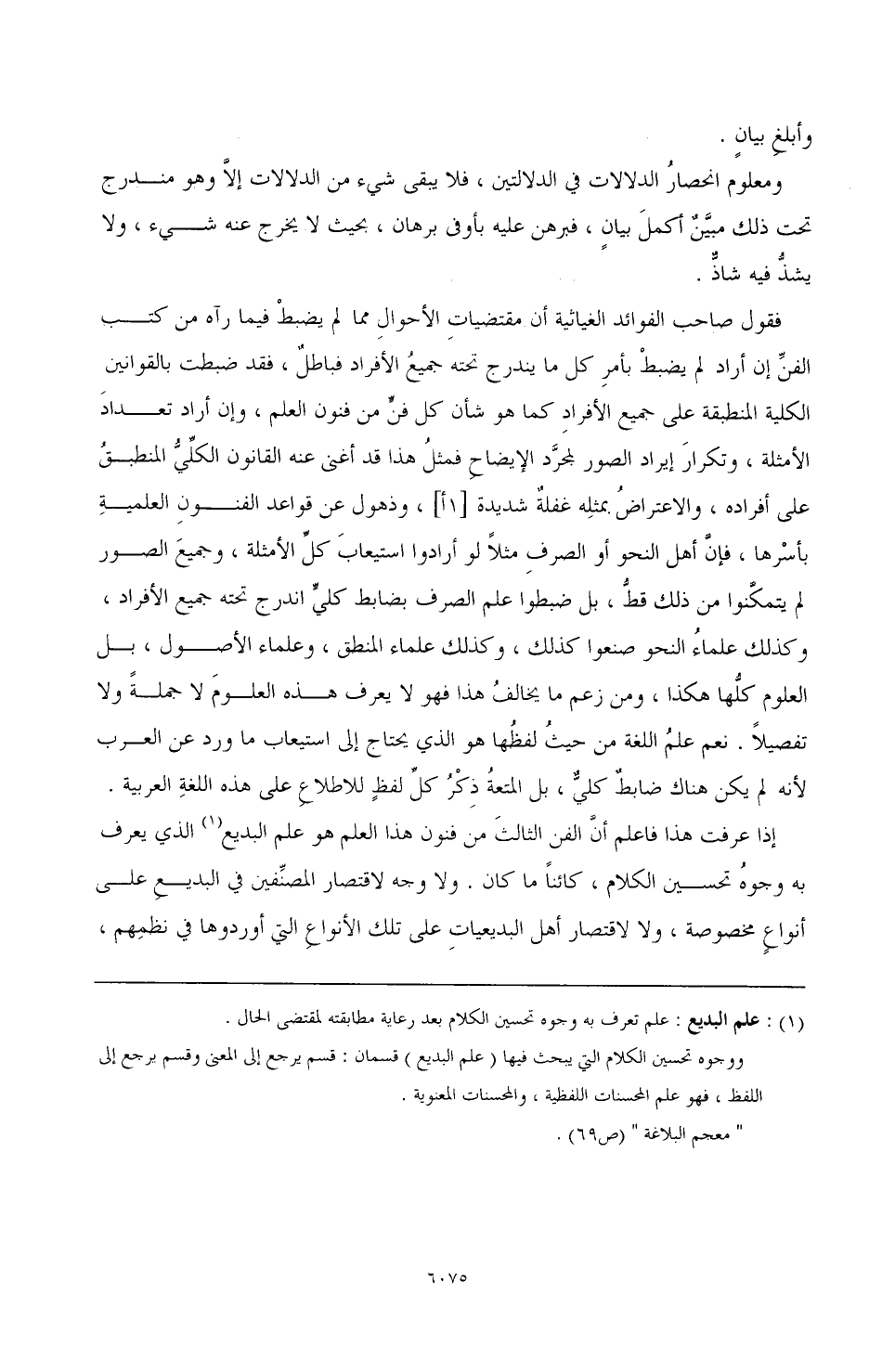 فقول صاحب الفوائد الغياثية أن مقتضياتِ الأحوال مما لم يضبطْ فيما رآه من كتب الفنِّ إن أراد لم يضبطْ بأمر كل ما يندرج تحته جميعُ الأفراد فباطلٌ, فقد ضبطت بالقوانين الكلية المنطبقة على جميع الأفراد كما شأن كل فنٍّ من فنون العلم, وإن أراد تعدادَ الأمثلة, وتكرارَ إيراد الصور لمجرَّد الإيضاحِ فمثلُ هذا قد أغنى عنه القانون الكلِّيُّ المنطبقُ على أفراده, والاعتراضُ بمثله غفلةٌ شديدة [1أ]، وذهول عن قواعد الفنونِ العلميةِ بأسْرها، فإنَّ أهل النحو أو الصرف مثلاً لو أرادوا استيعابَ كلِّ الأمثلةِ، وجميعَ الصور لم يتمكَّنوا من ذلك قطٌُ، بل ضبطوا علم الصرف بضابط كليٍّ اندرج تحته جميع الأفراد، وكذلك علماءُ النحو صنعوا كذلك، وكذلك علماء المنطق، وعلماء الأصول، بل العلوم كلُّها هكذا، ومن زعم ما يخالفُ هذا فهو لا يعرف هذه العلومَ لا جملةً ولا تفصيلاً نعم علم اللغة من حيثُ لفظُها هو الذي يحتاج إلى استيعاب ما ورد عن العرب لأنه لم يكن هناك ضابطٌ كليٌّ، بل المتعةُ ذِكْرُ كلِّ لفظٍ للاطلاعِ على هذه اللغةِ العربية.