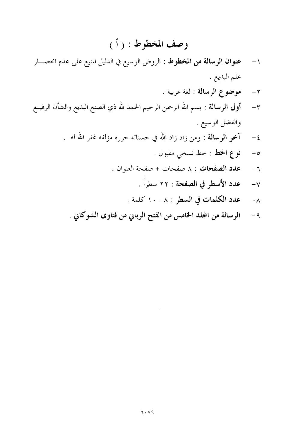 1 ـ عنوان الرسالة من المخطوط: الروض الوسيع في الدليل المنيع على عدم انحصار علم البديع.