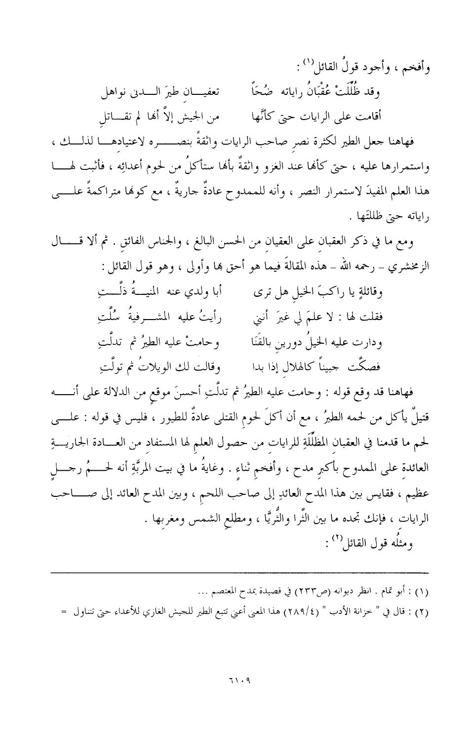 (¬2) قال في (خزانة الأدب) (4/ 289) هذا المعنى أعني تتبع الطير للجيش الغازي للأعداء حتى تتناول من القتلى متداولٌ بين الشعراء قديمًا وحديثًا وأوّل من جاء به الأفوَهُ الأوديُّ في قوله: