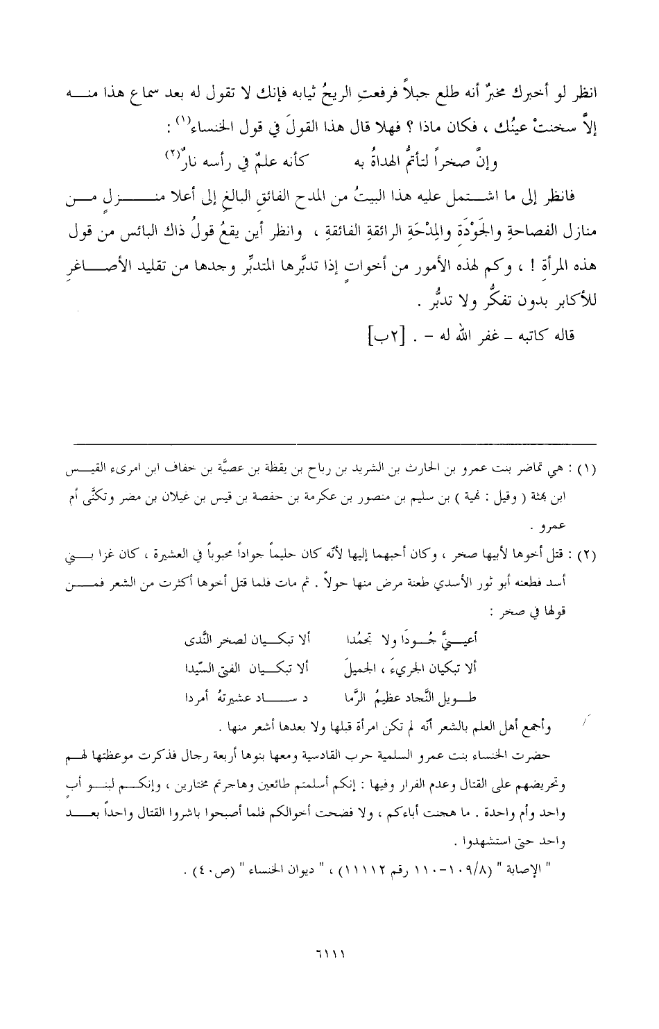 انظر لو أخبرك مخبرٌ أنه طلع جبلاً فرفعتِ الريحُ ثيابه فإنك لا تقول له بعد سماع هذا منه إلاَّ سخنْت عينُك، فكان ماذا؟ فهلا قال هذا القولَ في قول الخنساء (¬1):