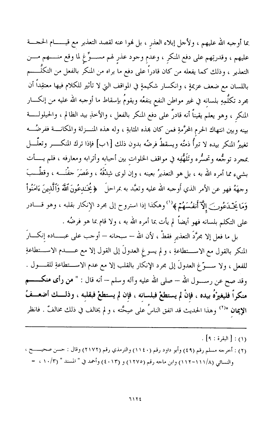 بما أوجبه الله عليهم، ولأجل إبلاء العذرِ، بل نهوا عنه لقصد التعذير مع قيام الحجة عليهم، وقدرتِهم على دفع المنكرِ، وعدمِ وجود عذرٍ لهم مسوِّغٍ لما وقع منهم من التعذير، وذلك كما يفعله من كان قادرًا على دفع ما يراه من المنكر بالفعل من التكلُّم باللسان مع ضعف عزيمةٍ، وانكسار شكيمةٍ في المواقف التي لا تأثير للكلام فيها معتِقدًا أن مجر تكلُّمِهِ بلسانِه في غير مواطن النفعِ ينفعُه ويقومُ بإسقاط ما أوجبه الله عليه من إنكار المنكرِ، وهو يعلم يقينًا أنه قادرٌ على دفع المنكر بالفعل، والأخذِ بيد الظالم، والحيلولة بينه وبين انتهاك الحرمِ المحرَّمةِ فمن كان بهذه المثابةِ، وله هذه المنزلة والمكانة ففرضُه تغييرُ المنكر بيده لا تبرأُ ذمتُه ويسقطُ فرضُه بدون ذلك [1ب] فإذا ترك المنكر وتعلَّل بمجرد توجُّعه وتحسُّره وتَلَهُّفِه في مواقف الخلواتِ بين أحبابِه وأترابه ومعارفه، فلم يأت بشيء مما أمره الله به، بل هو التعذيرُ بعينه، وإن لوى شِدْقَهُ وعَصَر جفْنَه، وقطَّبَ وجهَهُ فهو عن الأمر الذي أوجبه الله عليه وتعبَّد به بمراحلَ {يُخَادِعُونَ اللَّهَ وَالَّذِينَ آمَنُوا وَمَا يَخْدَعُونَ إِلَّا أَنْفُسَهُمْ} (¬1) وهكذا استروح إلى مجرد الإنكار بقلبه، وهو قادر على التكلم بلسانه فهو أيضًا لم يأت بما أمره الله به، ولا قام بما هو فرضُه.