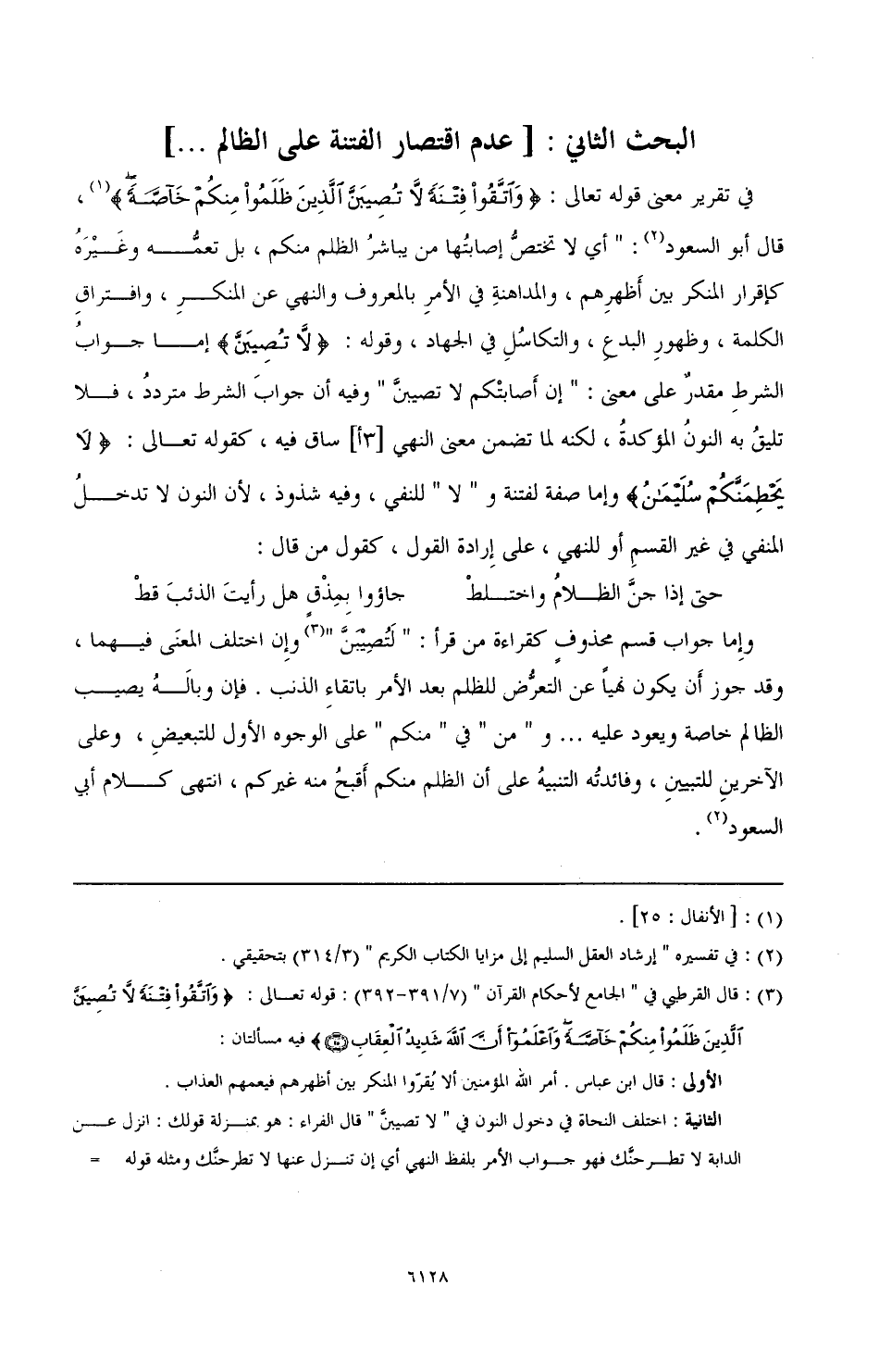 (¬3) قال القرطبي في (الجامع لأحكام القرآن) (7/ 391 ـ 392): قوله تعالى: {وَاتَّقُوا فِتْنَةً لَا تُصِيبَنَّ الَّذِينَ ظَلَمُوا مِنْكُمْ خَاصَّةً وَاعْلَمُوا أَنَّ اللَّهَ شَدِيدُ الْعِقَابِ} فيه مسألتان: