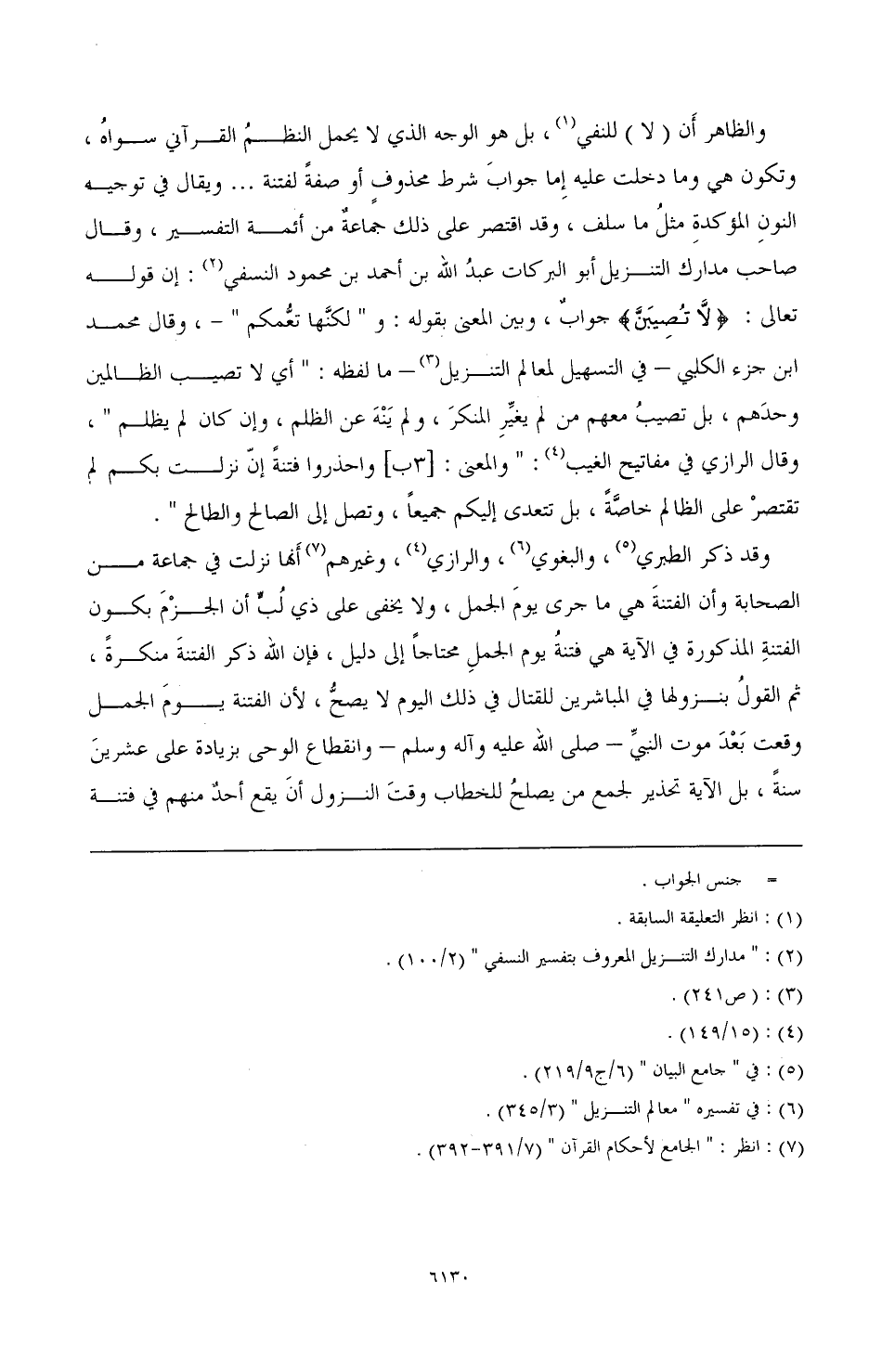 والظاهر أَن (لا) للنفي (¬1)، بل هو الوجه الذي لا يحمل النظمُ القرآني سواهُ، وتكون هي وما دخلت عليه إما جوابَ شرط محذوفٍ أو صفةًً لفتنة ... ويقال في توجيه النونِ المؤكدةِ مثلُ ما سلف، وقد اقتصر على ذلك جماعةٌ من أئمة التفسير، وقال صاحب مدارك التنزيل أبو البركات عبدُ الله بن أحمد بن محمود النسفي (¬2): إن قوله تعالى: {لَا تُصِيبَنَّ} جوابٌ، وبين المعنى بقول: و (لكنَّها تعمُّكم) ـ، وقال محمد بن جزء الكلبي ـ في التسهيل لمعالم التنزيل (¬3) ما لفظه: (أي لا تصيب الظالمين وحدَهم، بل تصيبُ معهم من لم يغيِّر المنكرَ، ولم يَنْهَ عن الظلم، وإن كان لم يظلم)، وقال الرازي في مفاتيح الغيب (¬4): (والمعنى: [3ب] واحذروا فتنةً إن نزلت بكم لم تقتصرْ على الظالم خاصَّةً، بل تتعدي إليكم جميعًا، وتصل إلى الصالح والطالح).