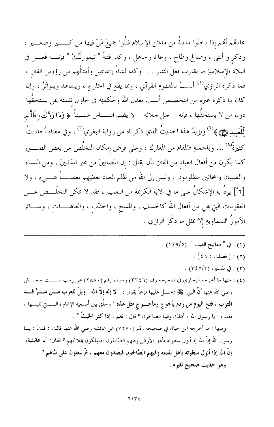 عادتهم أنهم إِذا دخلوا مدينةً من مدائن الإسلام قتلُوا جميع من فيها من كبير وصغير, وذكرٍ وأنثى, وصالح وطالحِ, وعالم وجاهل, وكذا فتنةُ (تيمورلَنْكْ) فإنه فعل في البلاد الإِسلاميةِ ما يقارب فعل التتار ... وكذا لشاهُ إسماعيل وأمثالُهم من رءوس الفتنِ, فما ذكره الرازي (¬1) أنسب بالمفهوم القرآني, وبما يقع في الخارج, ويشاهد ويتواتَرُ, وإن كان ما ذكره غيره من التخصيص أَنسبَ بعدل الله وحكمتِه في حلول نقمته بمن يستحقُّها دون من لا يستحقُّها, فإنه ـ جل جلاله ـ لا يظلم الناس شيئًا {وَمَا رَبُّكَ بِظَلَّامٍ لِلْعَبِيدِ} [فصلت:46] ويؤيدُ هذا الحديثُ الذي ذكرناه من رواية البغوي, (¬2) وفي معناه أَحاديثُ كثيرة (¬3) وبالجملةِ فالمقام من المعارك, وعلى فرض إمكان التخلُّ عن بعض الصور كما يكون من أفعال العبادِ من الفتن بأن يقال: إن المصابينَ من غير المذنبينَ, ومن النساء والصبيان والمجانين مظلمون, وليس إلى الله من ظلم العباد بعضِهم لعضًا شيء, ولا [6أ] يردُّ به الإشكال على ما في الآية الكريمة من التعميم, فقد لا يمكن التخلُّص عن العقوبات التي هى من أفعال الله كالخسفِ, والمسخِ, والجدْسِ, والعاهاتِ, وسائر الأمورُ السماويةِ إلا بمثل ما ذكَرَ الرازي.