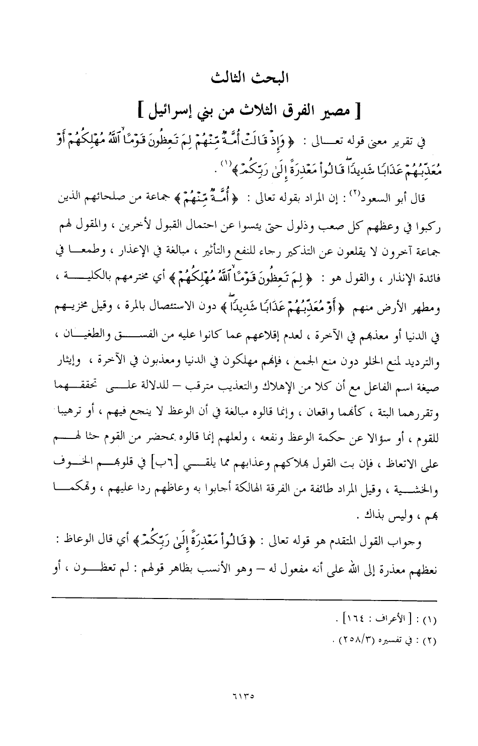 في تقرير معنى قوله تعالى: {وَإِذْ قَالَتْ أُمَّةٌ مِنْهُمْ لِمَ تَعِظُونَ قَوْمًا اللَّهُ مُهْلِكُهُمْ أَوْ مُعَذِّبُهُمْ عَذَابًا شَدِيدًا قَالُوا مَعْذِرَةً إِلَى رَبِّكُمْ}. [الأعراف:164]