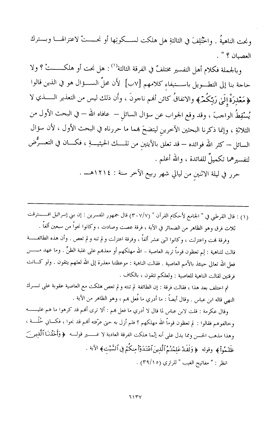 وبالجملة فكلام أهل التفسير مختلفٌ في الفرقة الثالثة (¬1): هل نجت أو هلكتْ؟ ولا حاجة بنا إلى التطويل باستيفاءِ كلامهم [7ب] لأَن محلَّ السؤال هو في الذين قالوا {مَعْذِرَةً إِلَى رَبِّكُمْ} والاتفاقُ كائن أنهم ناجونَ، وأَن ذلك ليس من التعذير الذي لا يُسْقِطُ الواجبَ، وقد وقع الجواب عن سؤال السائلِ ـ عافاه الله ـ في البحث الأول من الثلاثةِ، وإنما ذكرنا البحثين الآخرينِ ليتضحَ بهما ما حررناه في البحث الأول، لأن سؤال السائل كثر الله فوائده قد تعلق بالآيتين من تلك الحيثية فكان في التعرُّض لتفسيرهما تكميلٌ للفائدة والله أعلم.