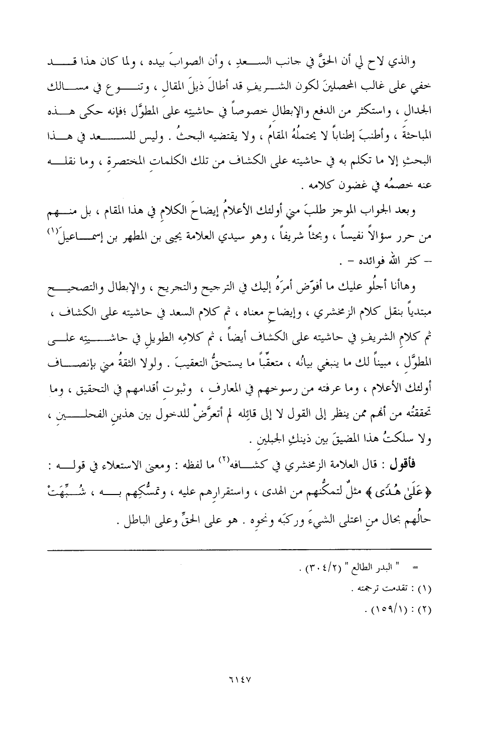 والذي لاح لي أن الحقَّ في جانب السعدِ، وأن الصوابَ بيده، ولما كان هذا قد خفي على غالب المحصلينَ لكون الشريفَ قد أطالَ ذيلَ المقالِ، وتنوع في مسالك الجدالِ، واستكثر من الدفع والإبطالِ خصوصًا في حاشيتِه على المطوَّل، فإنه حكى هذه المباحثةَ، وأطنبَ إطنابًا لا يحتملُهُ المقامُ، ولا يقتضيه البحثُ. وليس للسعد في هذا البحثِ إلا ما تكلم به في حاشيته على الكشاف من تلك الكلماتِ المختصرةِ، وما نقله عنه خصمهُ في غضون كلامه.