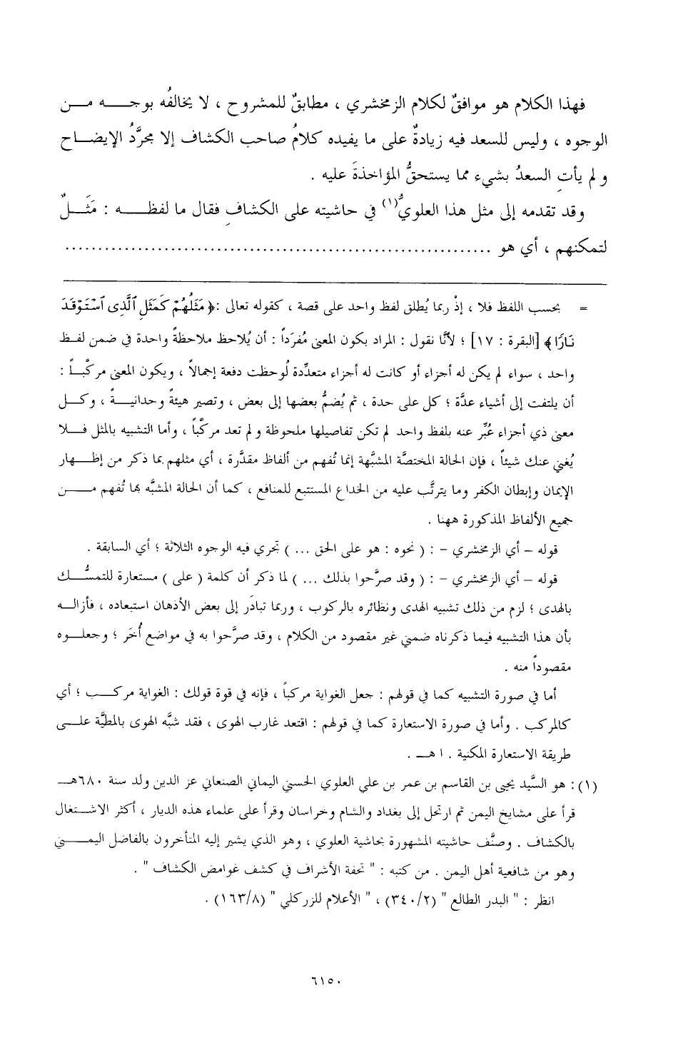 (¬1) هو السَّيد يحيى بن القاسم بن عمر بن علي العلوي الحسني اليماني الصنعاني عز الدين ولد سنة 680 هـ قرأ على مشايخ اليمن ثم ارتحل إلى بغداد والشام وخراسان وقرأ على علماء هذه الديار, أكثر الاشتغال بالكشاف. وصنَّف حاشيته المشهورة بحاشية العلي, وهو الذي يشير إليه المتأخرون بالفاضل اليمني وهو من شافعية أهل اليمن. من كتبه: (تحفة الأشراف في كشف غوامض الكشاف).
