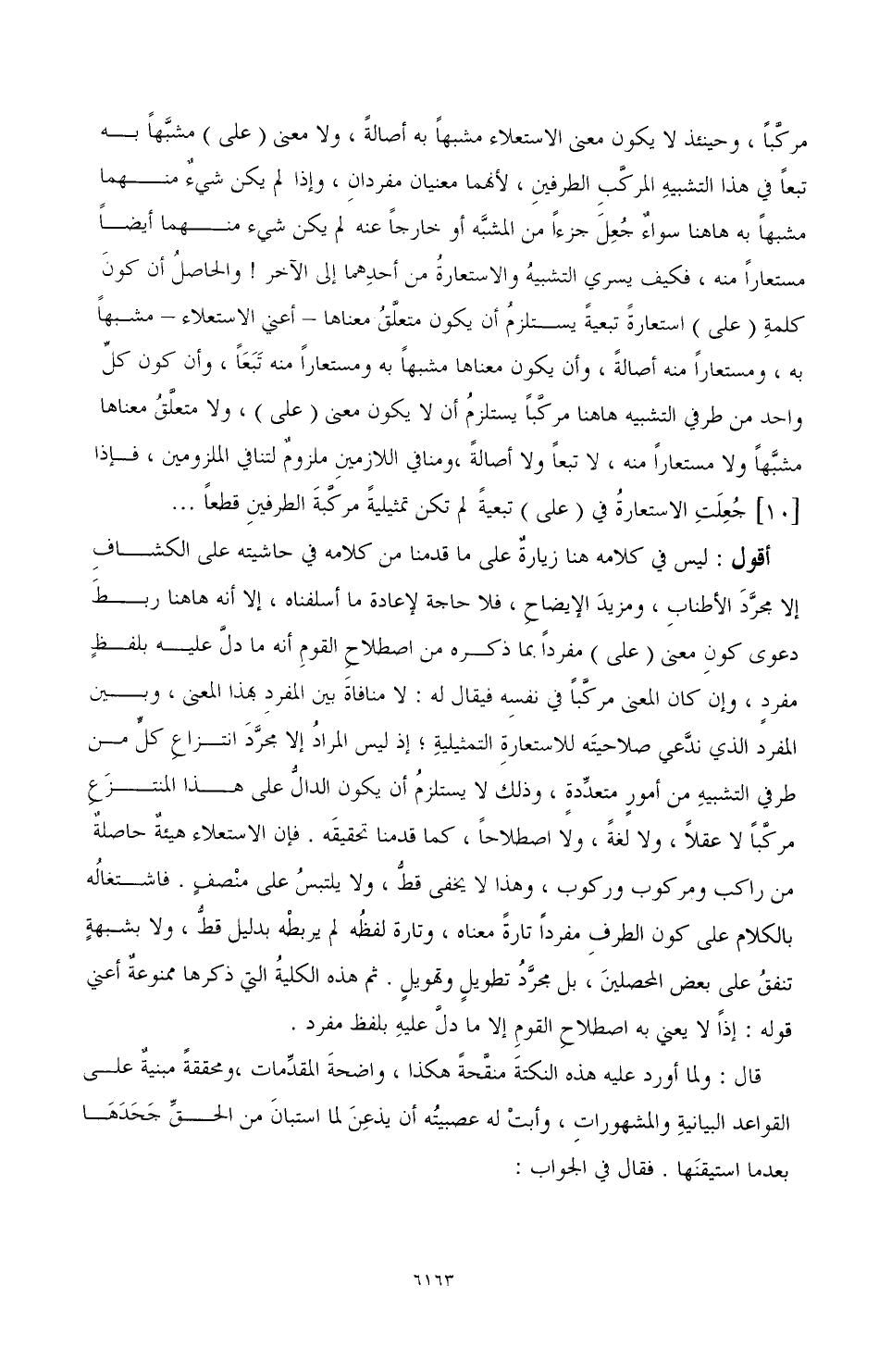 مركَّبًا، وحينئذ لا يكون معنى الاستعلاء مشبهًا به أصالةً، ولا معنى (على) مشبَّهًا به تبعًا في هذا التشبيهِ المركَّبِ الطرفينِ، لأنهما معنيان مفردانِ، وإذا لم يكن شيءٌ منهما مشبهًا به هاهنا سواءٌ جُعِلَ جزءًا من المشبَّه أو خارجًا عنه لم يكن شيء منهما أيضًا مستعارًا منه، فكيف يسري التشبيهُ والاستعارةُ من أحدِهما إلى الآخر! والحاصلُ أن كونَ كلمةِ (على) استعارةً تبيعةً يستلزمُ أن يكون متعلَّق معناها ـ أعني الاستعلاء ـ مشبهًا به، ومستعارًا منه أصالةً، وأن يكون معناها مشبهًا به ومستعارًا منه تَبَعًا، وأن كون كلِّ واحد من طرفي التشبيه هاهنا مركَّبًا يستلزمُ أن لا يكون معنى (على)، ولا متعلَّقُ معناها مشبَّهًا ولا مستعارًا منه، لا تبعًا ولا أصالةً، ومنافي اللازمينِ ملزومٌ لتنافي الملزومين، فإذا [10] جُعِلَتِ الاستعارةُ في (على) تبعيةً لم تكن تمثيليةً مركَّبةَ الطرفينِ قطعًا ...