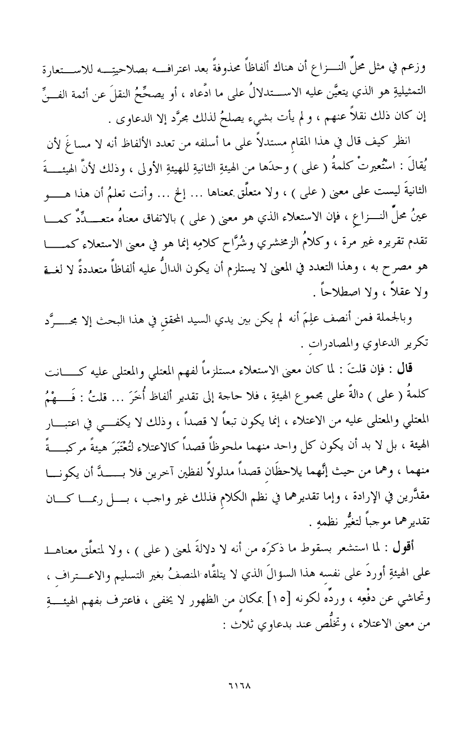 انظر كيف قال في هذا المقامِ مستدلاً على ما أسلفه من تعدد الألفاظ أنه لا مساغَ لأن يُقال: اسْتُعيرتْ كلمةُ (على) وحدَها من الهيئةِ الثانيةِ للهيئة الأولى، وذلك لأنَّ الهيئةَ الثانيةَ ليست على معنى (على)، ولا متعلَّق بمعناها ... إلخ ... وأنت تعلمُ أن هذا هو عينُ محلِّ النزاعِ، فإن الاستعلاء الذي هو معنى (على) بالاتفاق معناهُ متعدِّدٌ كما تقدم تقريره غير مرة، وكلامُ الزمخشري وشُرَّاح كلامِه إنما هو في معنى الاستعلاء كما هو مصرح به، وهذا التعدد في المعنى لا يستلزم أن يكون الدالُّ عليه ألفاظًا متعددةً لا لغة ولا عقلاً، ولا اصطلاحًا.