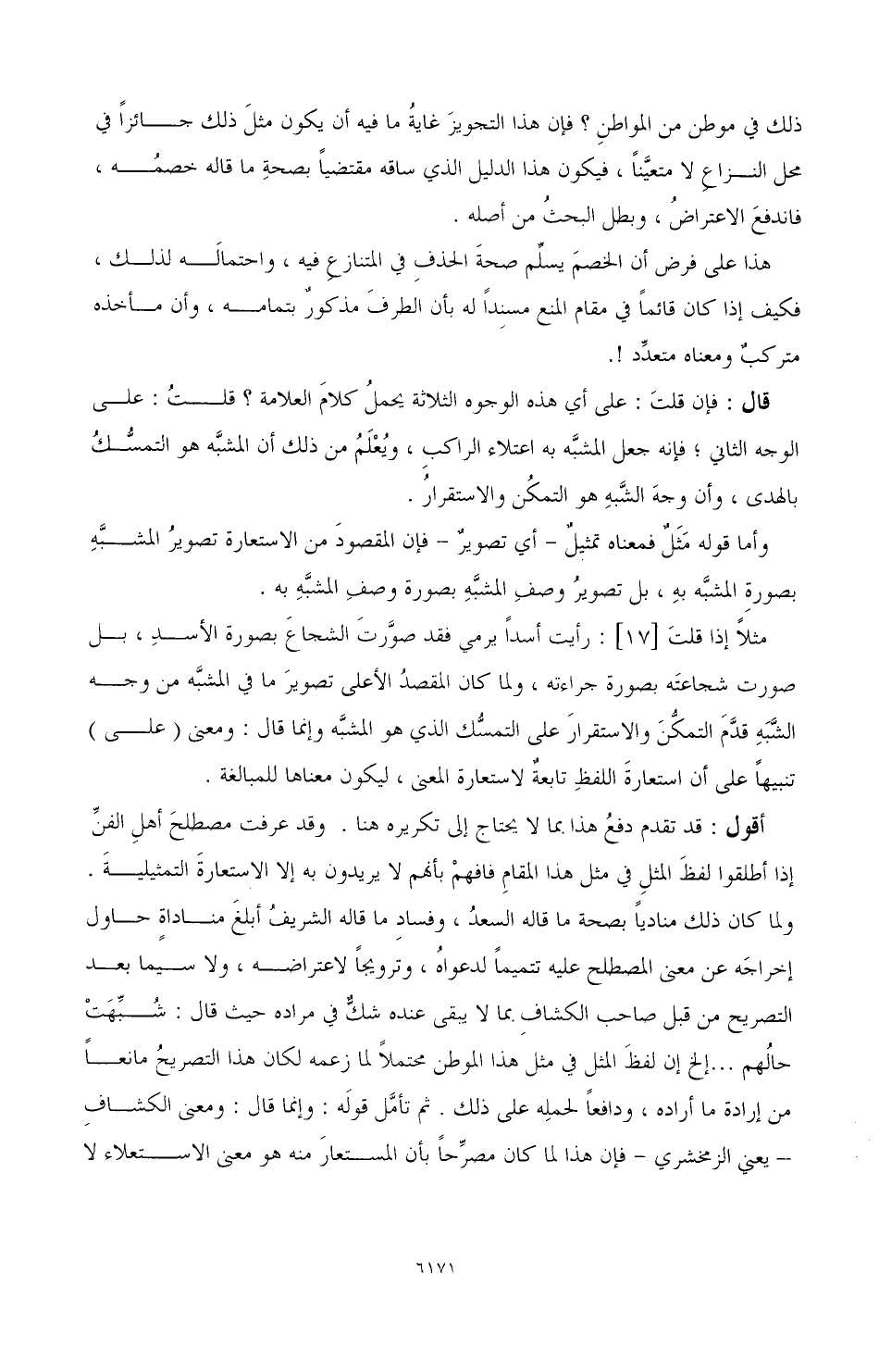 قال: فإن قلتَ: على أي هذه الوجوه الثلاثة يحملُ كلامَ العلامة؟ قلتُ: على الوجه الثاني، فإنه جعل المشبَّه به اعتلاء الراكبِ، ويُعْلَمُ من ذلك أن المشبَّه هو التمسُّكُ بالهدى، وأن وجهَ الشَّبِه هو التمكن والاستقرارُ.