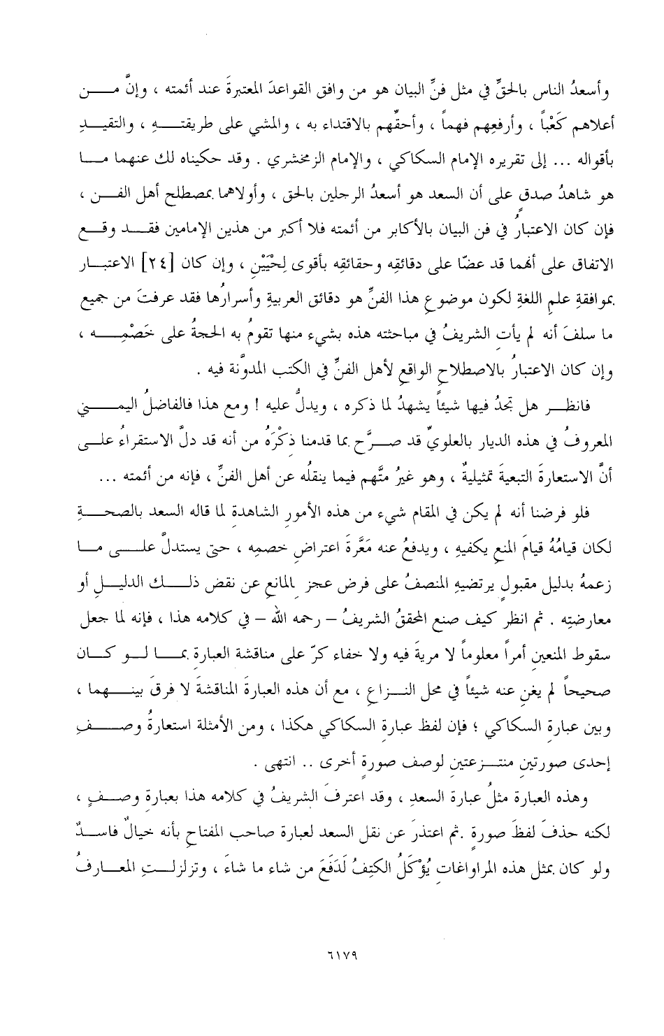 وأسعدُ الناس بالحقِّ في مثل فنِّ البيان هو من وافق القواعدَ المعتبرةَ عند أئمته، وإنَّ من أعلاهم كَعْبًا، وأرفعِهم فهمًا، وأحقَّهم بالاقتداء به، والمشي على طريقتهِ، والتقيدِ بأقواله ... إلى تقريره الإمام السكاكي، والإمام الزمخشري. وقد حكيناه لك عنهما ما هو شاهدُ صدقٍ على أن السعد هو أسعدُ الرجلين بالحق، وأولاهما بمصطلح أهل الفن، فإن كان الاعتبارُ في فن البيان بالأكابر من أئمته فلا أكبر من هذين الإمامين فقد وقع الاتفاق على أنهما قد عضّا على دقائقِه وحقائقِه بأقوى لِحْيَيْن، وإن كان [24] الاعتبار بموافقةِ علمِ اللغةِ لكون موضوعِ هذا الفنِّ هو دقائق العربيةِ وأسرارُها فقد عرفتَ من جميع ما سلفَ أنه لم يأتِ الشريفُ في مباحثته هذه بشيء منها تقومُ به الحجةُ على خَصْمِه، وإن كان الاعتبارُ بالاصطلاحِ الواقع لأهل الفنِّ في الكتب المدوَّنة فيه.