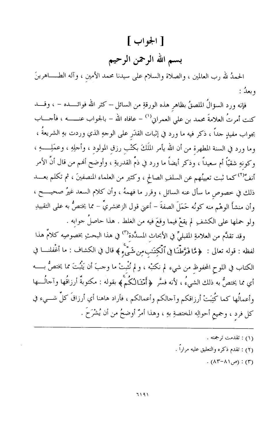 فإنه ورد السؤالُ الملصقُ بظاهر هذه الورقةِ من السائل ـ كثر الله فوائده ـ، وقد كنت أمرتُ العلامة محمد بن علي العمراني (¬1) ـ عافاه الله ـ بالجواب عنه، فأجاب بجواب مفيدٍ جدًّا، ذكر فيه ما ورد في إثبات القدَرِ على الوجهِ الذي وردت بهِ الشريعةُ، وما ورد في السنة المطهرةِ من أن الله يأمر الملَكَ بكتْب رزقِ المولودِ، وأجلِهِ، وعمَلِهِ، وكونهِ شقيًّا أم سعيدًا، وذكر أيضًا ما ورد في ذمِّ القدريةِ، وأوضح أنهم من قال أنَّ الأمر أنفٌ (¬2) كما ثبت تعيينُهم عن السلفِ الصالحِ، وكثير من العلماء المنصفينَ، ثم تكلم بعد ذلك في خصوصِ ما سأل عنه السائل، وقرر ما فهمهُ، وأن كلام السعد غيرُ صحيح، وأن منشأَ الوهْم منه كونُه حَمَلَ الصفةَ ـ أعني قول الزمخشريِّ ـ مما يختصُّ به على التقييدِ ولو حملها على الكشفِ لم يقعْ فيما وقعَ فيه من الغلط. هذا حاصلُ جوابِه.