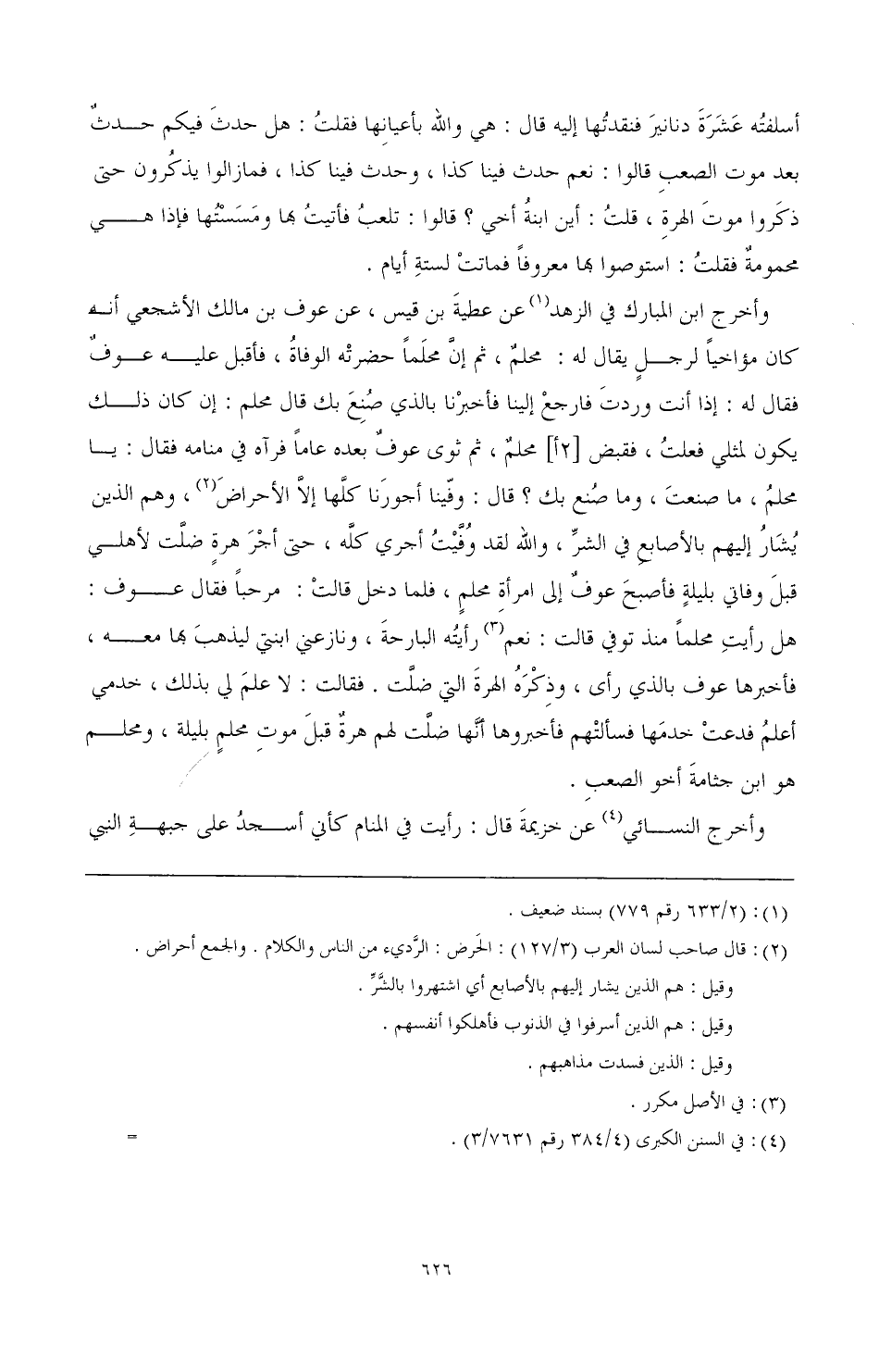 وأخرج ابن المبارك في الزهد (¬1) عن عطية بن قيس، عن عوف بن مالك الأشجعي أنه كان مؤاخيا لرجل يقال له: محلم، ثم إن محلما حضرته الوفاة، فأقبل عليه عوف فقال له: إذا أنت وردت فارجع إلينا فأخبرنا بالذي صنع بك قال محلم: إن كان ذلك يكون لمثلي فعلت، فقبض [2أ] محلم، ثم ثوى عوف بعده عاما فرآه في منامه فقال: يا محلم، ما صنعت، وما صنع بك؟ قال: وفينا أجورنا كفها إلا الأحراض (¬2)، وهم الذين يشار إليهم بالأصابع في الشر، والله لقد وفيت أجري كفه، حتى أجر هرة ضلت لأهلي قبل وفاتي بليلة فأصبح عوف إلى امرأة محلم، فلما دخل قالت: مرحبا فقال عوف: هل رأيت محلما منذ توفي قالت: نعم (¬3) رأيته البارحة، ونازعني ابنتي ليذهب بها معه، فأخبرها عوف بالذي رأى، وذكره الهرة التي ضلت. فقالت: لا علم لي بذلك، خدمي أعلم فدعت خدمها فسألتهم فأخبروها أنها ضلت لهم هرة قبل موت محلم بليله، ومحلم هو ابن جثامة أخو الصعب.