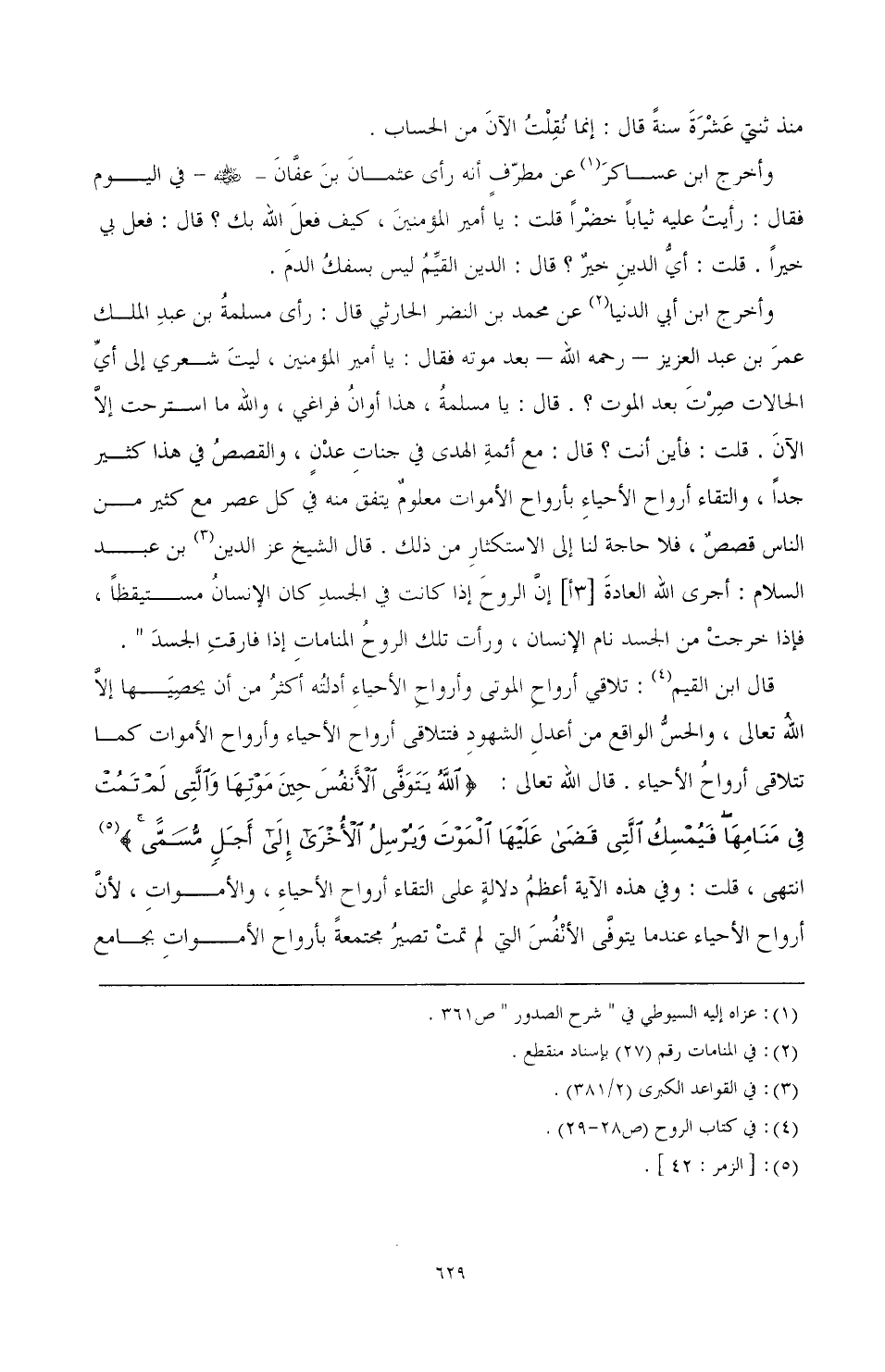 وأخرج ابن أبي الدنيا (¬2) عن محمد بن النضر الحارثي قال: رأى مسلمة بن عبد الملك عمر بن عبد العزيز- رحمه الله- بعد موته فقال: يا أمير المؤمنين، ليت شعري إلى أي الحالات صرت بعد الموت؟. قال: يا مسلمة، هذا أوان فراغي، والله ما استرحت إلا الآن. قلت: فأين أنت؟ قال: مع أئمة الهدى في جنات عدن، والقصص في هذا كثير جدا، والتقاء أرواح الأحياء بأرواح الأموات معلوم يتفق منه في كل عصر مع كثير من الناس قصص، فلا حاجة لنا إلى الاستكثار من ذلك. قال الشيخ عز الدين (¬3) بن عبد السلام: أجرى الله العادة [3أ] إن الروح إذا كانت في الجسد كان الإنسان مستيقظا، فإذا خرجت من الجسد نام الإنسان، ورأت تلك الروح المنامات إذا فارقت الجسد ". قال ابن القيم (¬4): تلاقي أرواح الموتى وأرواح الأحياء أدلته أكثر مع أن يحصيها إلا الله تعالى، والحس الواقع من أعدل الشهود فتتلاقى أرواح الأحياء وأرواح الأموات كما تتلاقى أرواح الأحياء. قال الله تعالى: {الله يتوفى الأنفس حين موتها والتي لم تمت في منامها فيمسك التي قضى عليها الموت ويرسل الأخرى إلى أجل مسمى} (¬5) انتهى، قلت: وفي هذه الآية أعظم دلالة على التقاء أرواح الأحياء، والأموات، لأن أرواح الأحياء عندما يتوفى الأنفس التي لم تمت تصير مجتمعة بأرواح الأموات بجامع
