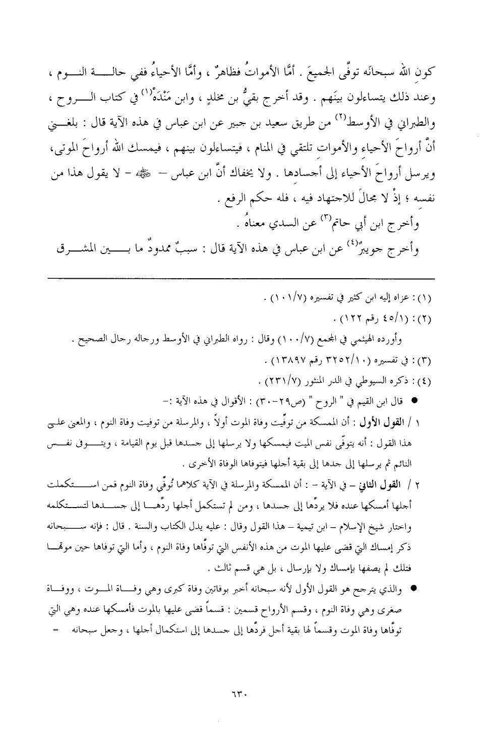 والذي يترجح هو القول الأول لأنه سبحانه أخبر بوفاتين وفاة كبرى وهي وفاة الموت، ووفاة صغرى وهي وفاة النوم، وقسم الأرواح قسمين: قسما قضى عليها بالموت فأمسكها عمده وهى التي توفاها وفاة الموت وقسما لها بقية أحل فردها إلى جسدها إلى استكمال أجلها، وجعل سبحانه الإمساك والإرسال حكمين للوفاتين المذكورتين أولا فهذه ممسكة وهذه مرسلة، وأخبر أن التي لم تمت هذه التي توفاها في منامها، فلو كان قد قسم وفاة النوم إلى قسمين: وفاة موت، ووفاة نوم لم يقل {والتي لم تمت في منامها} فإنها من حين قبضت ماتت، وهو سبحانه قد أخبر أنها لم تمت فكيف يقول بعد ذلك {يمسك التي قضى علتها الموت} ولمن نصر هذا القول أن يقول: قوله تعالى: {فيمسك التي قضى عليها الموت} بعد أن توفاها وفاة النوم، فهو سبحانه توفاها أولا وفاة نوم، ثم قضى عليها الموت بعد ذلك، والتحقيق أن الآية تتناول النوعين، فإله سبحانه ذكر وفاتين وفاة نوم، ووفاة موت، وذكر إمساك المتوفاه وإرسال الأخرى ومعلوم أنه سبحانه يمسك كل نفس ميت سواء مات في النوم أو في اليقظة، ويرسل نفس من لم يمت. فقوله سبحانه & يتوفى الأنفس حين موتها، يتناول من مات في اليقظة ومن مات في المنام.