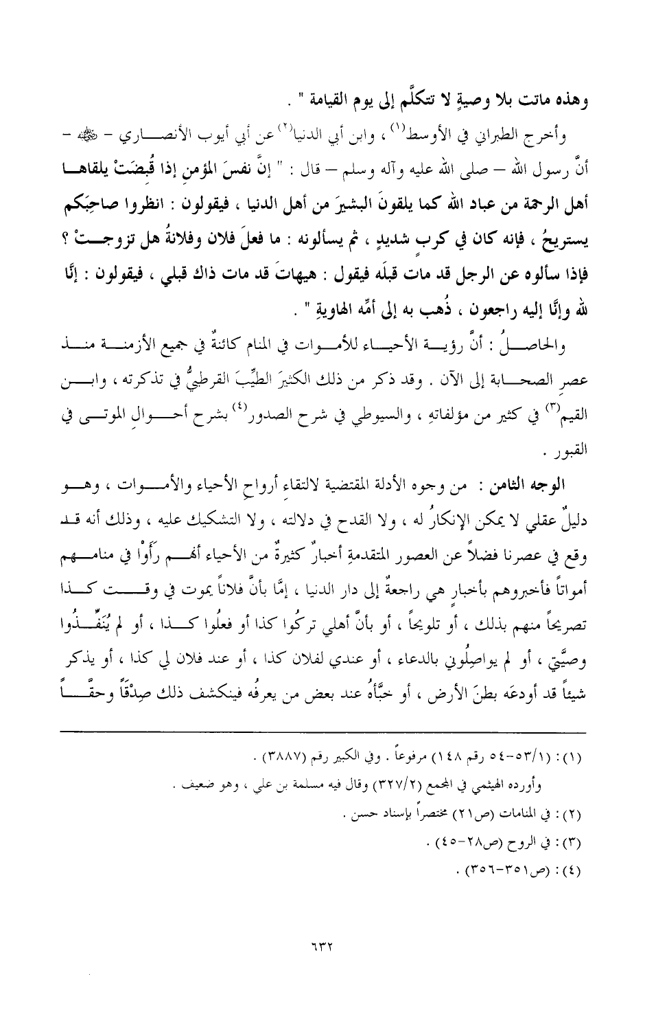 الوجه الثامن: من وجوه الأدلة المقتضية لالتقاء أرواح الأحياء والأموات، وهو دليل عقلي لا يمكن الإنكار له، ولا القدح في دلالته، ولا التشكيك عليه، وذلك أنه قد وقع في عصرنا فضلا عن العصور المتقدمة أخبار كثيرة من الأحياء أفم رأوا في منامهم أمواتا فأخبروهم بأخبار هي راجعة إلى دار الدنيا، إما بأن فلانا يموت في وقت كذا تصريحا منهم بذلك، أو تلويحا، أو بأن أهلي تركوا كذا أو فعلوا كذا، أو لم ينفذوا وصيتي، أو لم يواصلوني بالدعاء، أو عندي لفلان كذا، أو عند فلان لي كذا، أو يذكر شيئا قد أودعه بطن الأرض، أو خبأه عند بعض من يعرفه فينكشف ذلك صدقا وحقا