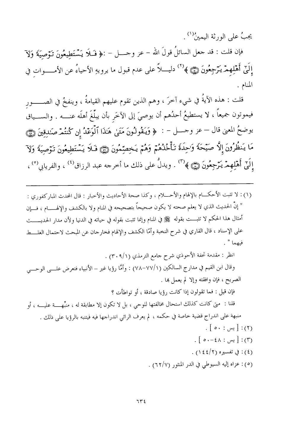 فإن قلت: قد جعل السائل قول الله- عز وجل-: {فلا يستطيعون توصية ولا إلى أهلهم ويرجعون} (¬2) دليلا على عدم قبول ما يرويه الأحياء عن الأموات في المنام.