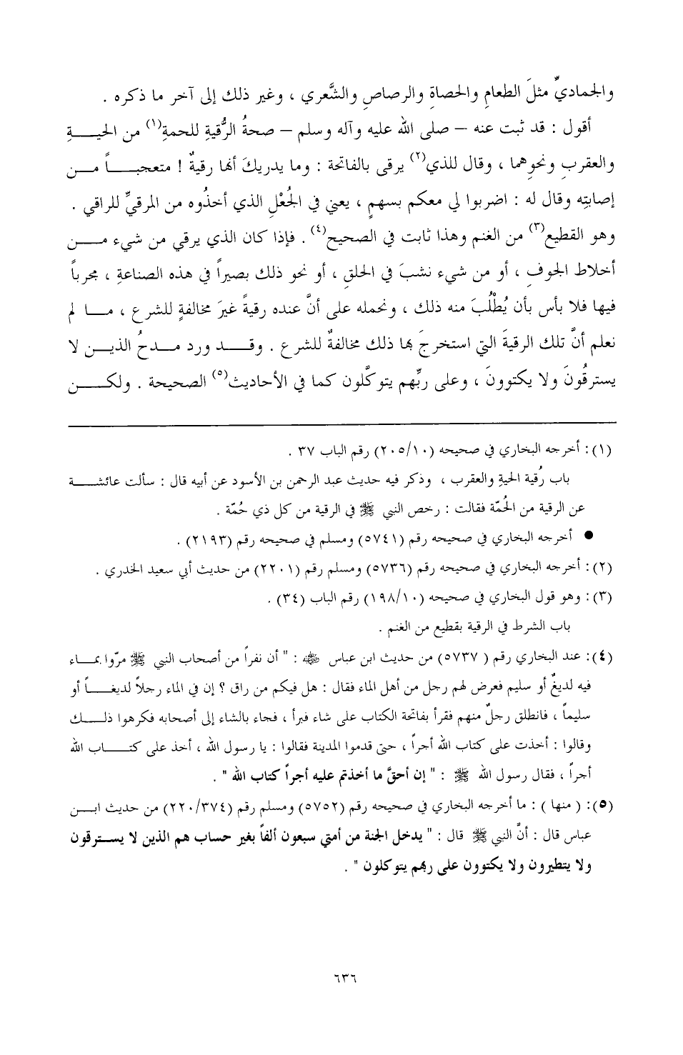 (¬5) (منها): ما أخرجه البخاري في صحيحه رقم (5752) ومسلم رقم (374/ 220) من حديث ابن عباس قال: أن النبي صَلَّى اللهُ عَلَيْهِ وَسَلَّمَ قال: " يدخل الجنة من أمتي سبعون ألف بغير حساب هم الذين لا يسترقون ولا يتطرون ولا يكتوون على ربهم يتوكلون ".
