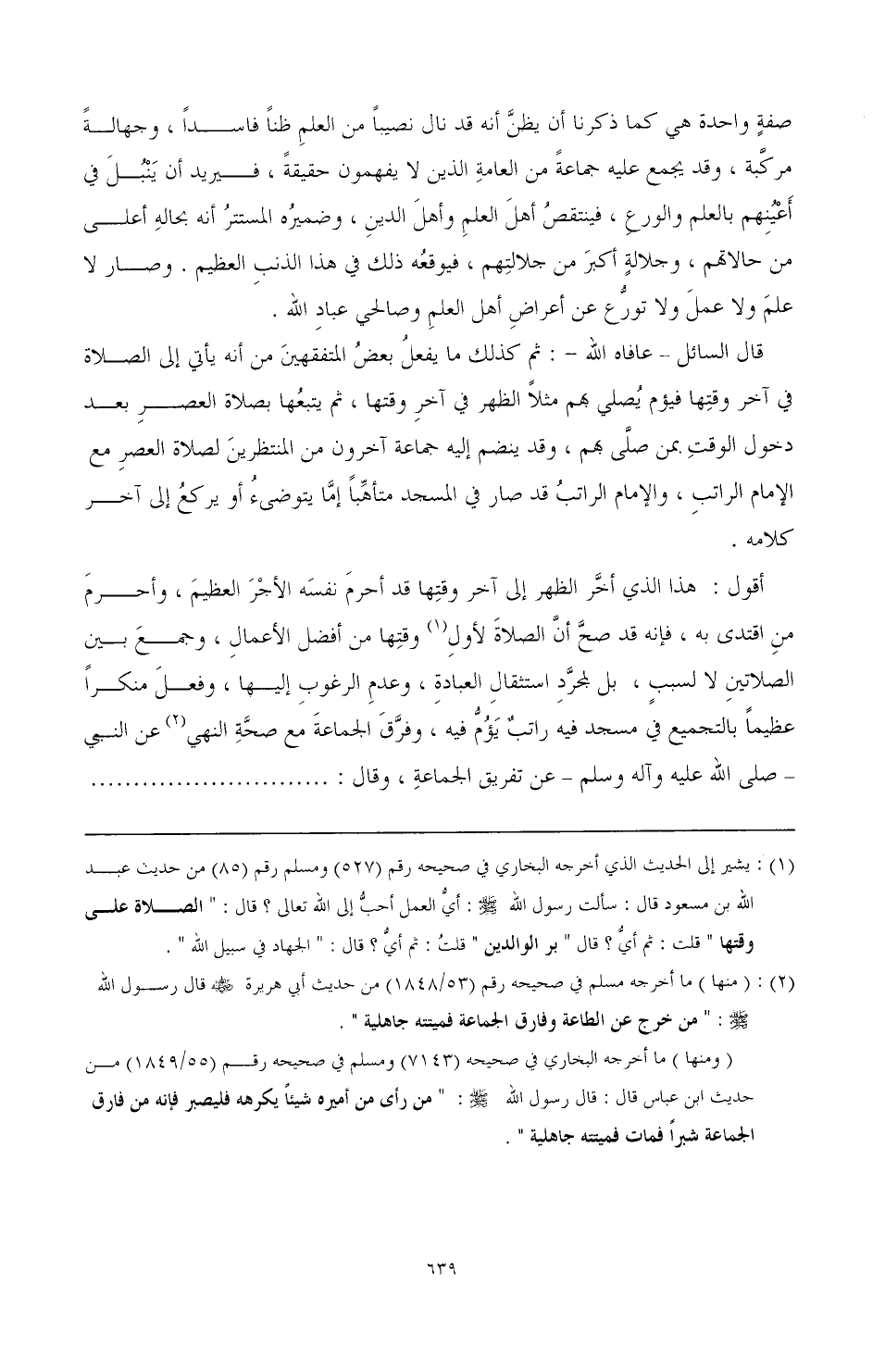 قال السائل- عافاه الله-: ثم كذلك ما يفعل بعض المتفقهين من أنه يأتي إلى الصلاة في آخر وقتها فيؤم يصلى هم مثلا الظهر في آخر وقتها، ثم يتبعها بصلاة العصر بعد دخول الوقت. ممن صفى هم، وقد ينضم إليه جماعة آخرون من المنتظرين لصلاة العصر مع الإمام الراتب، والإمام الراتب قد صار في المسجد متأهبا إما يتوضئ أو يركع إلى آخر كلامه.