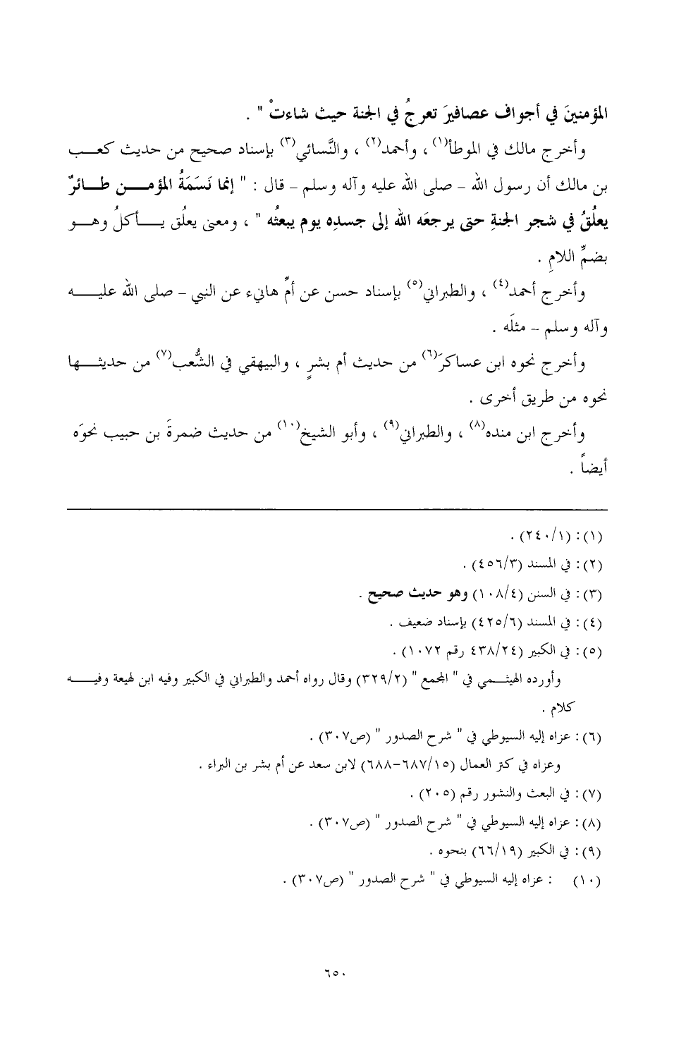 المؤمنين في أجواف عصافير تعرج في الجنة حيث شاءت ".