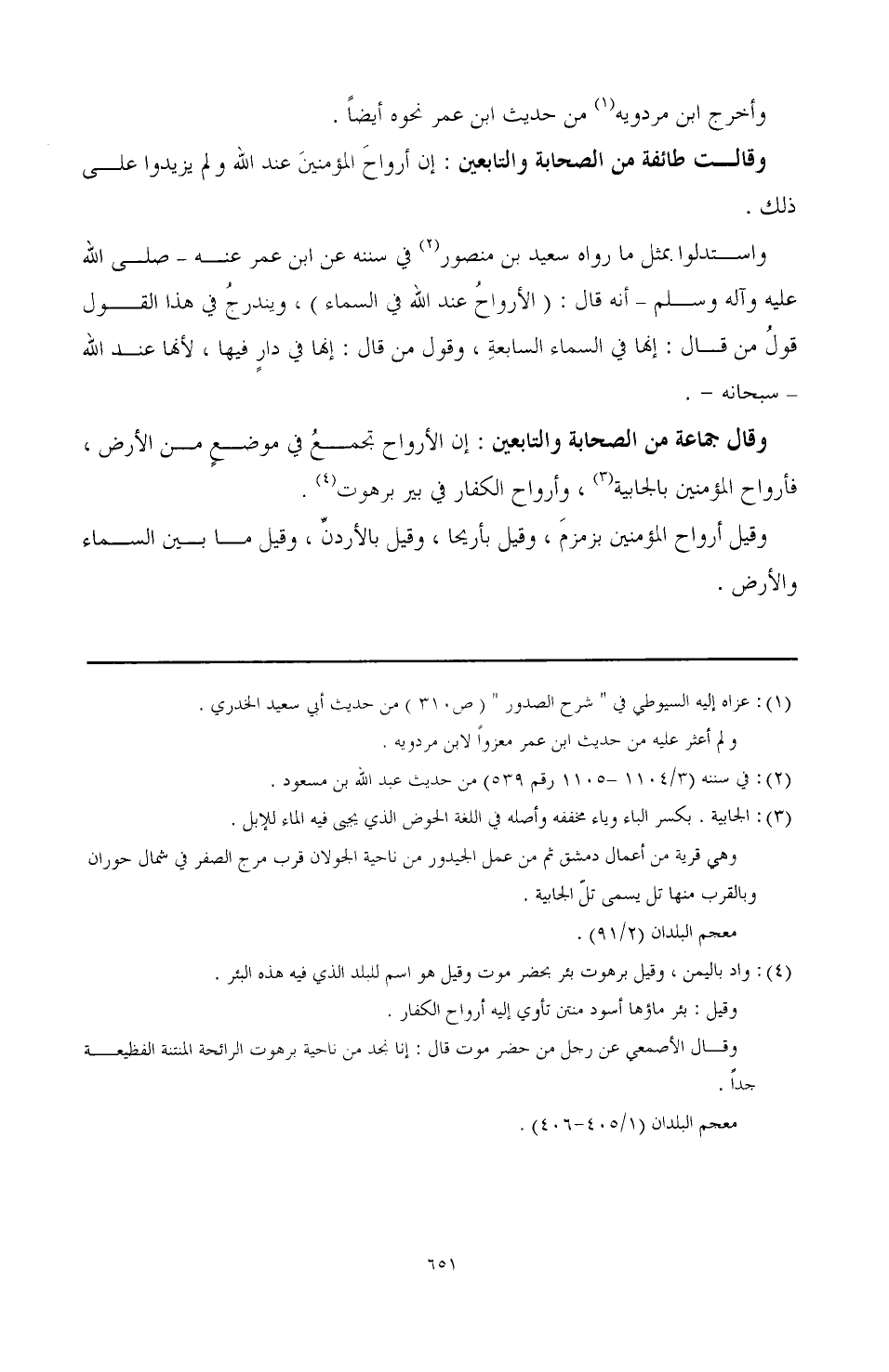 وقال جماعة من الصحابة والتابعين: إن الأرواح تجمع في موضع من الأرض، فأرواح المؤمنين بالجابية (¬3)، وأرواح الكفار في بير برهوت (¬4). وقيل أرواح المؤمنين بزمزم، وقيل بأريحا، وقيل بالأردن، وقيل ما بين السماء والأرض.