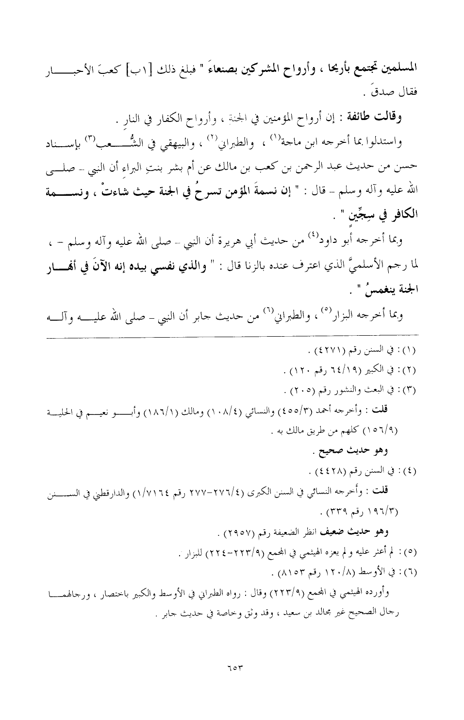 واستدلوا. مما أخرجه ابن ماجة (¬1)، والطبراني (¬2)، والبيهقي في الشعب (¬3) بإسناد حسن من حديث عبد الرحمن بن كعب بن مالك عن أم بشر بنت البراء أن النبي- صَلَّى اللهُ عَلَيْهِ وَآلِهِ وَسَلَّمَ- قال: " إن نسمة المؤمن تسرح في الجنة حيث شاءت، ونسمه الكافر في سجين ".