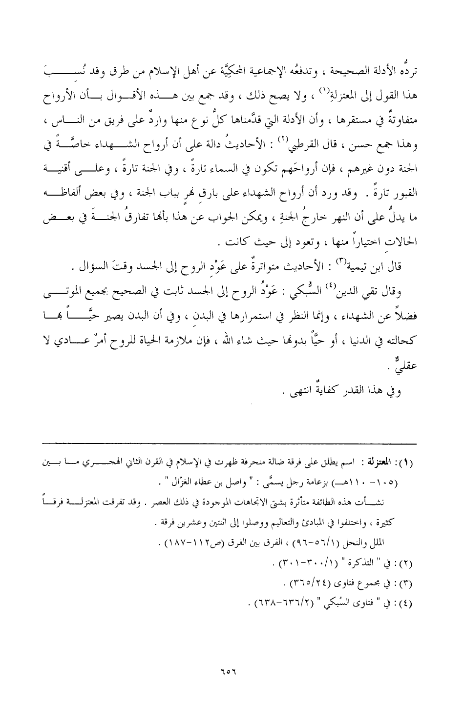 ترده الأدلة الصحيحة، وتدفعه الإجماعية المحكية عن أهل الإسلام من طرق وقد نص هذا القول إلى المعتزلة (¬1)، ولا يصح ذلك، وقد جمع بين هذه الأقوال بأن الأرواح متفاوتة في مستقرها، وأن الأدلة إلى قدمناها كل نوع منها وارد على فريق من الناس، وهذا جمع حسن، قال القرطبي (¬2): الأحاديث دالة على أن أرواح الشهداء خاصة في الجنة دون غيرهم، فإن أرواحهم تكون في السماء تارة، وفي الجنة تارة، وعلى أفنية القبور تارة. وقد ورد أن أرواح الشهداء على بارق نهر بباب الجنة، وفي بعض ألفاظه ما يدل على أن النهر خارج الجنة، ويمكن الجواب عن هذا بأنها تفارق الجنة في بعض الحالات اختيارا منها، وتعود إلى حيث كانت.