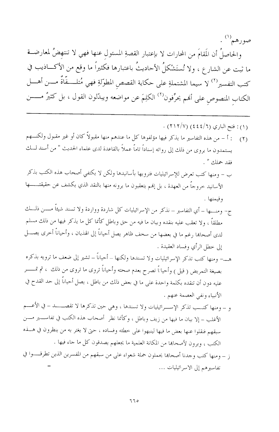 (¬2) أ- من هذه التفاسير ما يذكر فيها مؤلفوها كل ما عندهم منها مقبولا كان أو غير مقبول ولكن يستمدون ما يروى من ذلك إلى رواته إسنادا تاما عملا بالقاعدة لدى علماء الحديث "من أسند لك فقد حملك". ب- ومنها كتب تعرض للإسرائيليات فترويها بأسانيدها ولكن لا يكتفي أصحاب هذه الكتب بذكر الأسانيد خروجا من العهدة، بل إنهم يتعقبون ما يرونه منها بالنقد الذي يكشف عن حقيقتها وقيمتها. ج- ومنها - أي التفاسير - نذكر من الإسرائيليات كل شاردة وواردة ولا تسند شيئا من ذلك مطلقا، ولا تعقب عليه بنقده وبيان ما فيه من حق وباطل كأنما كل ما يذكر فيها من ذلك مسلم لدى أصحابها رغم ما في بعضها من سخف ظاهر يصل أحيانا إلى الهذيان، وأحيانا أخرى يصل إلى خطل الرأي وفساد العقيدة. هـ- ومنها كتب لذكر الإسرائيليات ولا تسندها ولكنها - أحيانا - تشير إلى ضعف ما ترويه بذكره بصيغة التمريض (قيل) وأحيانا تصرح بعدم صحته وأحيانا تروى ما تروى من دلك، ثم تمر عليه دون أن تنقده بكلمة واحدة على ما في بعض دلك من باطل، يصل أحيانا إلى حد القدح في الأنبياء ونفط العصمة عنهم. و- ومنها كتب تذكر الإسرائيليات ولا تسندها، وهي حين تذكرها لا تقصد - في الأعم الأغلب - إلا بيان ما فيها من زيف وباطل، وكأنما نظر أصحاب هذه الكتب في تفاسير من سبقهم فنقلوا عنها بعض ما فيها لينبهوا على خطه وفساده، حتى لا يغتر به من ينظرون في هذه