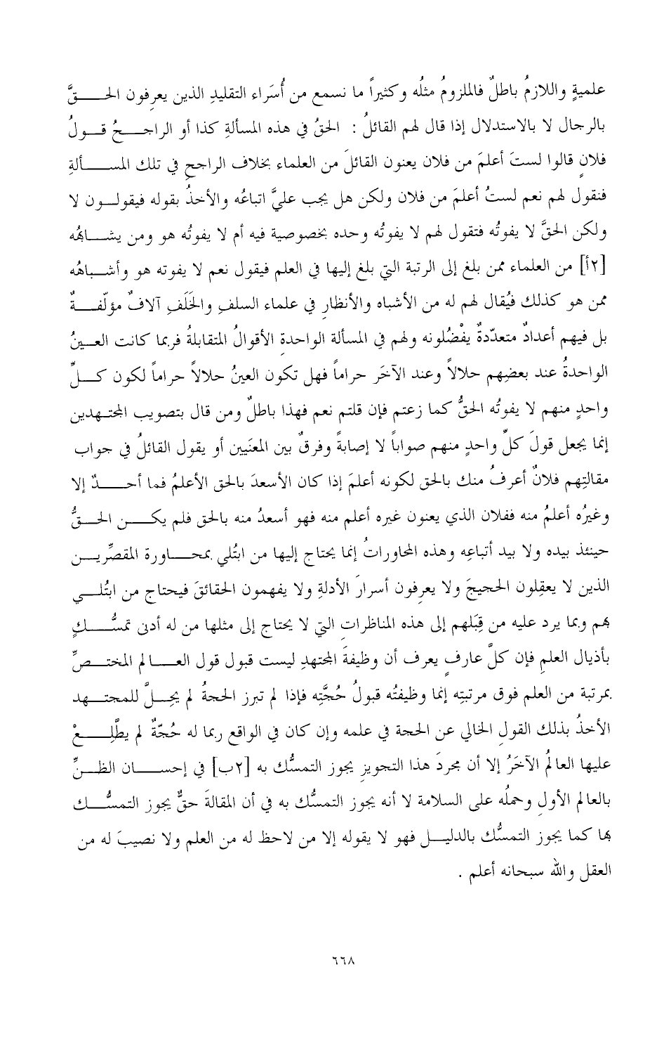 علمية واللازم باطل فالملزوم مثله وكثيرا ما نسمع من إسراء التقليد الذين يعرفون الحق بالرجال لا بالاستدلال إذا قال لهم القائل: الحق في هذه المسألة كذا أو الراجح قول فلان قالوا لست أعلم من فلان يعنون القائل من العلماء بخلاف الراجح في تلك المسألة فنقول لهم نعم لست أعلم من فلان ولكن هل يجب على إتباعه والأخذ بقوله فيقولون لا ولكن الحق لا يفوته فتقول لهم لا يفوته وحده بخصوصية فيه أم لا يفوته هو ومن يشابهه [2أ] من العلماء ممن بلغ إلى الرتبة إلى بلغ إليها في العلم فيقول نعم لا يفوته هو وأشباهه ممن هو كذلك فيقال لهم له من الأشباه والأنظار في علماء السلف والخلف آلاف مؤلفة بل فيهم أعداد متعددة يفضلونه ولهم في المسألة الواحدة الأقوال المتقابلة فربما كانت العين الواحدة عند بعضهم حلالا وعند الآخر حراما فهل تكون العين حلالا حراما لكون كل واحد منهم لا يفوته الحق كما زعمتم فإن قلتم نعم فهذا باطل ومن قال بتصويب المجتهدين إنما يجعل قول كل واحد منهم صوابا لا إصابة وفرق بين المعنيين أو يقول القائل في جواب مقالتهم فلان أعرف منك بالحق لكونه أعلم إذا كان الأسعد بالحق الأعلم فما أحد إلا وغره أعلم منه ففلان الذي يعنون غيره أعلم منه فهو أسعد منه بالحق فلم يكن الحق حتى بيده ولا بيد أتباعه وهذه المحاورات إنما يحتاج إليها من ابتلى.