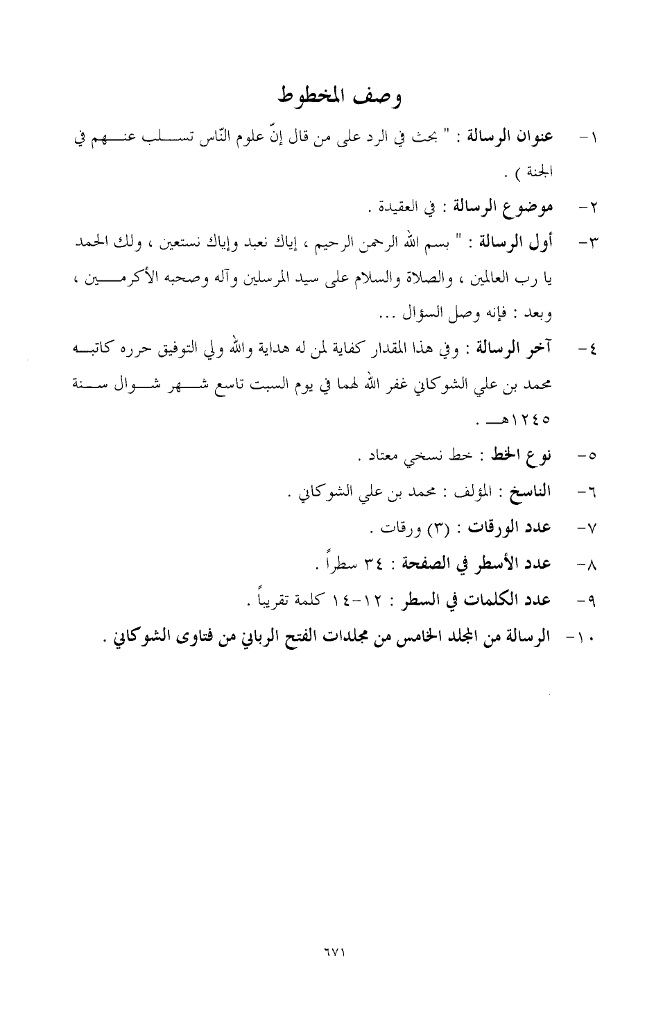 10 - الرسالة من المجلد الخامس من مجلدات الفتح الرباني من فتاوى الشوكاني.