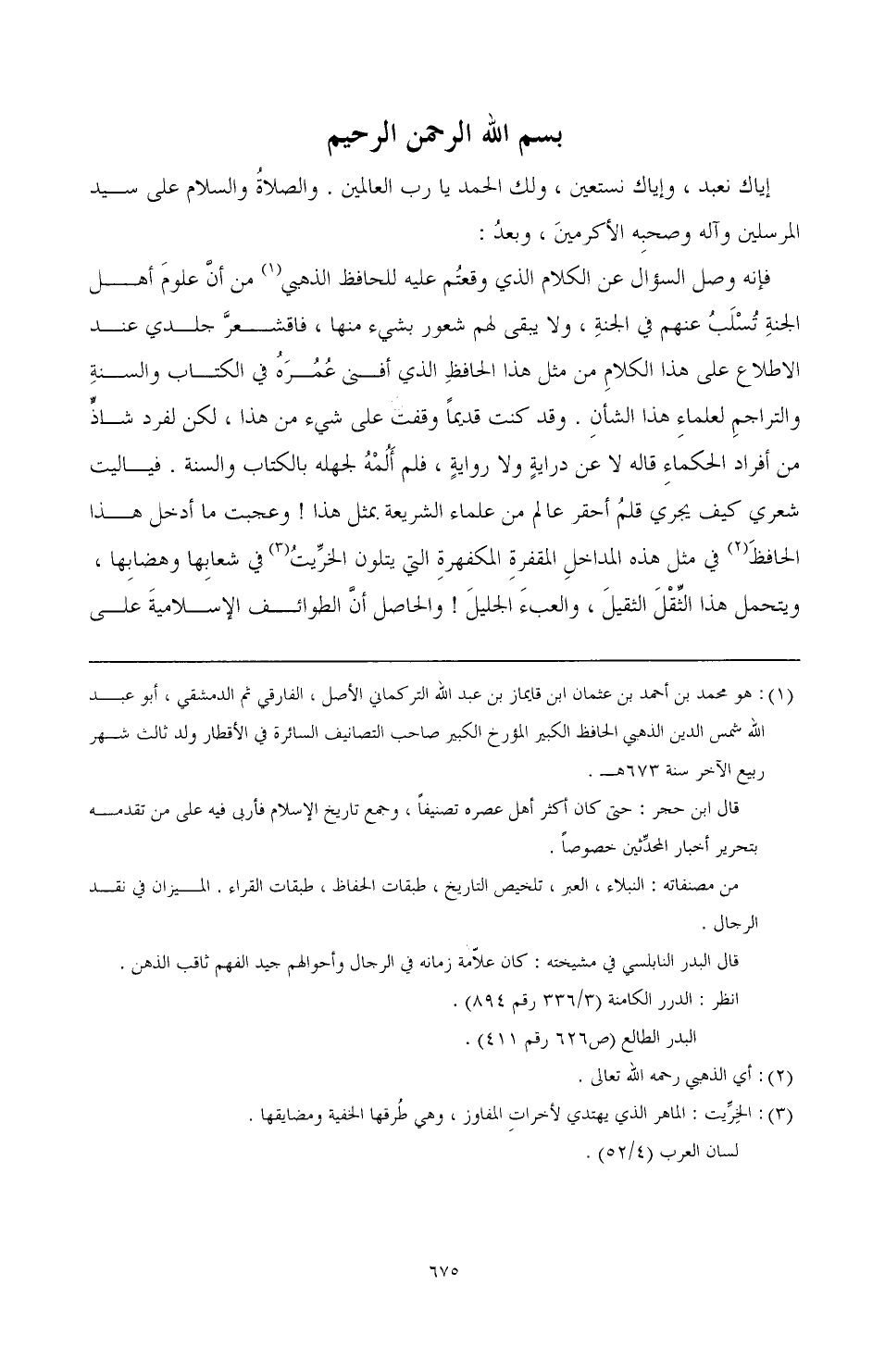فإنه وصل السؤال عن الكلام الذي وقعتم عليه للحافظ الذهبي (¬1) من أن علوم أهل الجنة تسلب عنهم في الجنة، ولا يبقى لهم شعور بشيء منها، فاقشعر جلدي عند الإطلاع على هذا الكلام من مثل هذا الحافظ الذي أفنى عمره في الكتاب والسنة والتراجم لعلماء هذا الشأن. وقد كنت قديما وقفت على شيء من هذا، لكن لفرد شاذ من أفراد الحكماء قاله لا عن دراية ولا رواية، فلم ألمه لجهله بالكتاب والسنة. فيا ليت شعري كيف يجري قلم أحقر عالم من علماء الشريعة. ممثل هذا! وعجبت ما أدخل هذا الحافظ (¬2) في مثل هذه المداخل المقفرة المكفهرة التي يتلون الخريت (¬3) في شعابها وهضابها، ويتحمل هذا الثقل الثقيل، والعبء الجليل! والحاصل أن الطوائف الإسلامية على