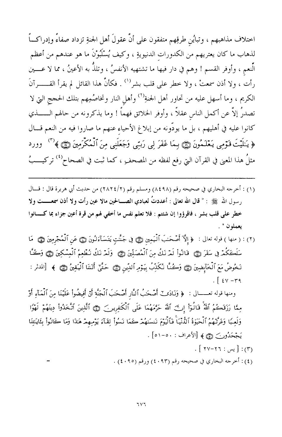 (¬1) أخرجه البخاري في صحيحه رقم (8498) ومسلم رقم (2/ 2824) من حديث أبي هريرة قال: قال رسول الله صَلَّى اللهُ عَلَيْهِ وَسَلَّمَ: " قال الله تعالى: أعددت لعبادي الصالحين ملا عين رأت ولا أذن سمعت ولا خطر على قلب بشر، فاقرؤوا إن شئتم: فلا تعلم نفس ما أخفي لهم من قرة أعين جزاء بما كانوا يعملون".