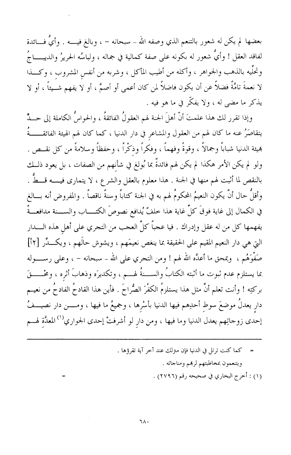 وإذا تقرر لك هذا علمت أن أهل الجنة لهم العقول الفائقة، والحواس الكاملة إلى حد يتقاصر عنه ما كان لهم من العقول والمشاعر في دار الدنيا، كما كان لهم الهيئة الفائقة هيئة الدنيا شبابا وجمالا، وقوة وفهما، وفكرا وذكرا، وحفظا وسلامة من كل نقص. ولو لم يكن الأمر هكذا لم يكن لهم فائدة. مما بولغ في شأنهم من الصفات، بل يعود ذلك بالنقص لما أثبت لهم منها في الجنة. هذا معلوم بالعقل والشرع، لا يتمارى فيه قط. وأقل حال أن يكون النعيم المحكوم لهم به في الجنة كتابا وسنة ناقصا. والمفروض أنه بالغ في الكمال إلى غاية فوق كل غاية هذا خلف يدافع نصوص الكتاب والسنة مدافعة يفهمها كل من له عقل وإدراك. فيا عجبا كل العجب من التجري على أهل هذه الدار التي هي دار النعيم المقيم على الحقيقة. مما ينغص نعيمهم، ويشوش حالهم، ويكدر [2أ] صفوهم، ويمحق ما أعده الله لهم! ومن التجري على الله- سبحانه-، وعلى رسوله. مما يستلزم عدم ثبوت ما أثبته الكتاب والسنة لهم، وتكديره وذهاب أثره، ومحق بركته! وأنت تعلم أن مثل هذا يستلزم الكفر الصراح. فأين هذا القادح الفادح من نعيم دار يعدل موضع سوط أحدهم فيها الدنيا بأسرها، وجميع ما فيها، ومن دار نصيف إحدى زوجاتهم يعدل الدنيا وما فيها، ومن دار لو أشرفت إحدى الجواري (¬1) المعدة لهم