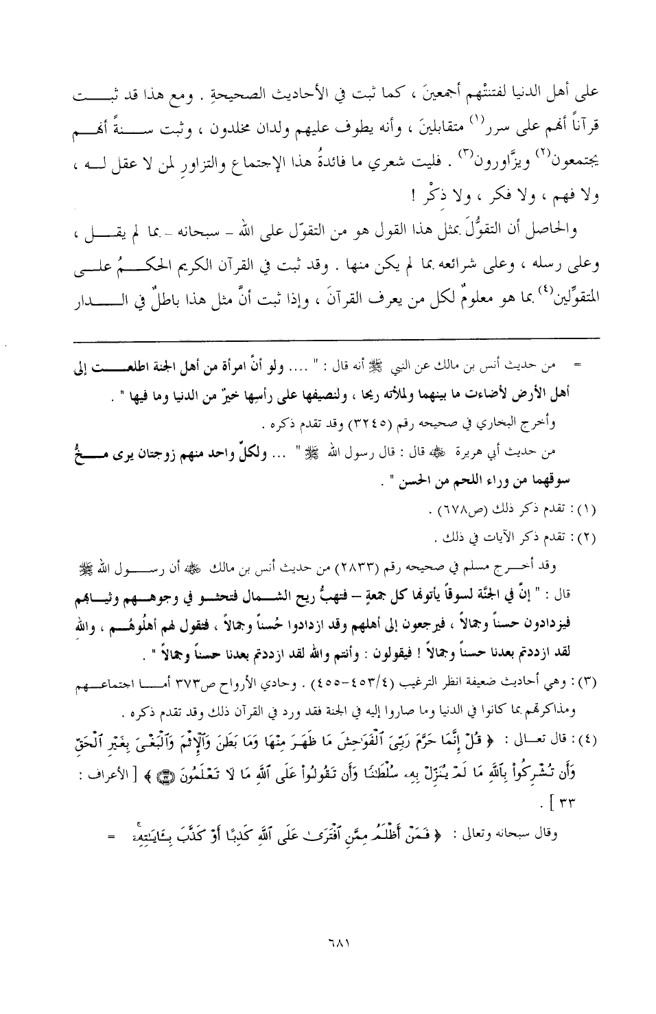 (¬3) وهى أحاديث ضعيفة انظر الترغيب (4/ 453 - 455). وحادي الأرواح ص 373 أما اجتماعهم ومذاكرتهم. مما كانوا في الدنيا وما صاروا إليه في الجنة فقد ورد في القرآن ذلك وقد تقدم ذكره