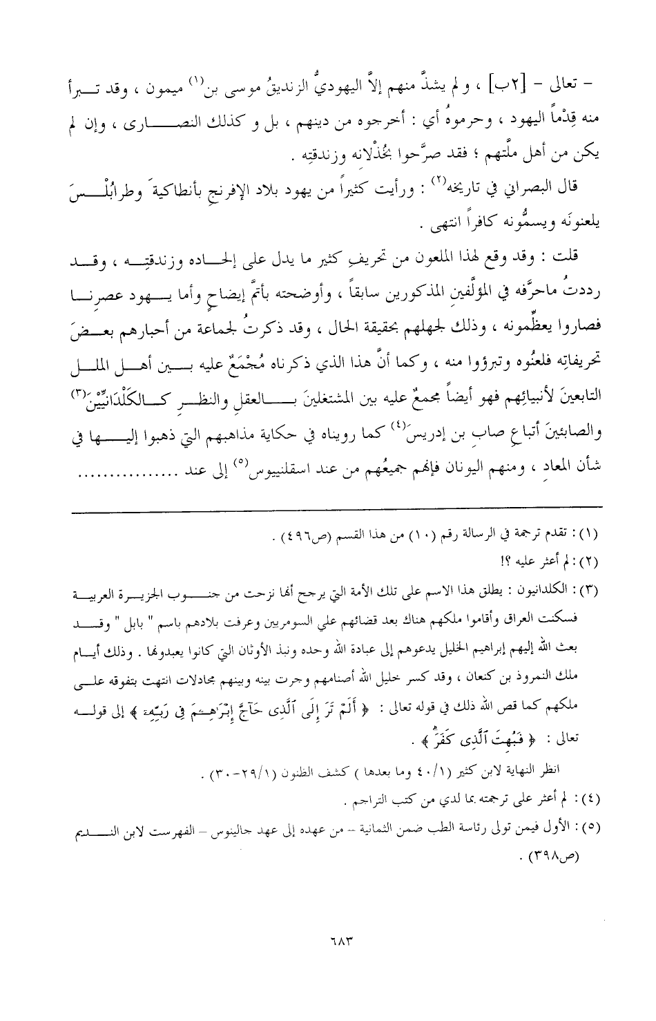 قلت: وقد وقع لهذا الملعون من تحريف كثير ما يدل على إلحاده وزندقته، وقد رددت ما حرفه في المؤلفين المذكورين سابقا، وأوضحته بأتم إيضاح وأما يهود عصرنا فصاروا يعظمونه، وذلك لجهلهم بحقيقة الحال، وقد ذكرت لجماعة من أحبارهم بعض تحريفاته فلعنوه وتبرؤوا منه، وكما أن هذا الذي ذكرناه مجمع عليه بين أهل الملل التابعين لأنبيائهم فهو أيضًا مجمع عليه بين المشتغلين بالعقل والنظر كالكلدانيين (¬3) والصابئين أتباع صاب بن إدريس (¬4) كما رويناه في حكاية مذاهبهم التي ذهبوا إليها في شأن المعاد، ومنهم اليونان فإنهم جميعهم من عند اسقلنييوس (¬5) إلى عند ....
