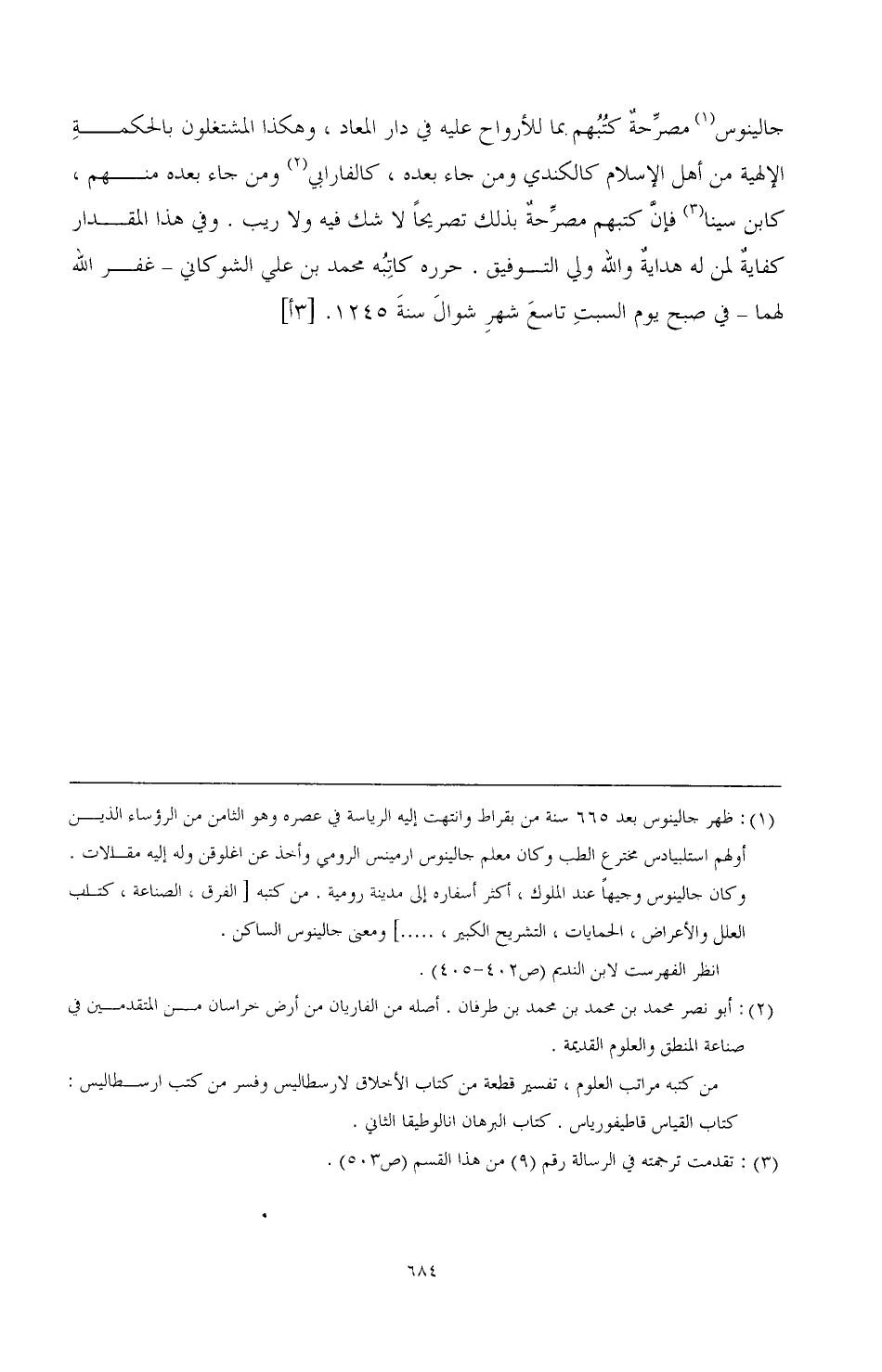 جالينوس (¬1) مصرحة كتبهم. مما للأرواح عليه في دار المعاد، وهكذا المشتغلون بالحكمة الإلهية من أهل الإسلام كالكندي ومن جاء بعده، كالفارابي (¬2) ومن جاء بعده منهم، كابن سينا (¬3) فإن كتبهم مصرحة بذلك تصريحا لا شك فيه ولا ريب. وفي هذا المقدار كفاية لمن له هداية والله ولي التوفيق. حرره كاتبه محمد بن علي الشوكاني- غفر الله لهما- في صبح يوم السبت تاسع شهر شوال سنة 1245. [3أ]