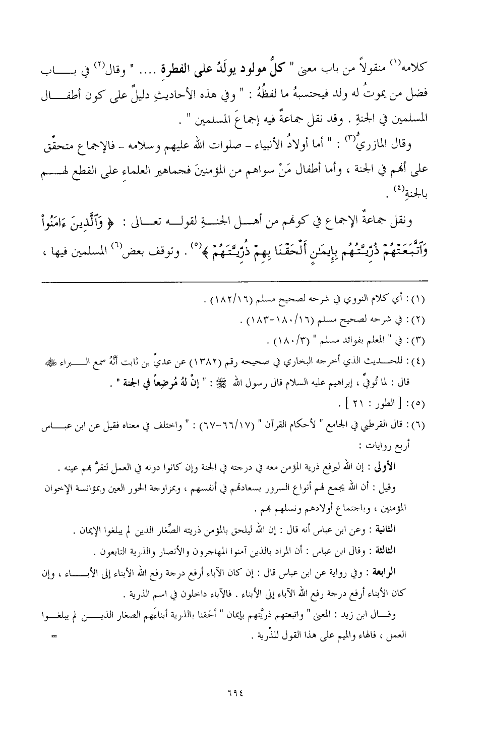 كلامه (¬1) منقولا من باب معنى " كل مولود يولد على الفطرة .... " وقال (¬2) في باب فضل من يموت له ولد فيحتسبه ما لفظه: " وفي هذه الأحاديث دليل على كون أطفال المسلمين في الجنة. وقد نقل جماعة فيه إجماع المسلمين ".