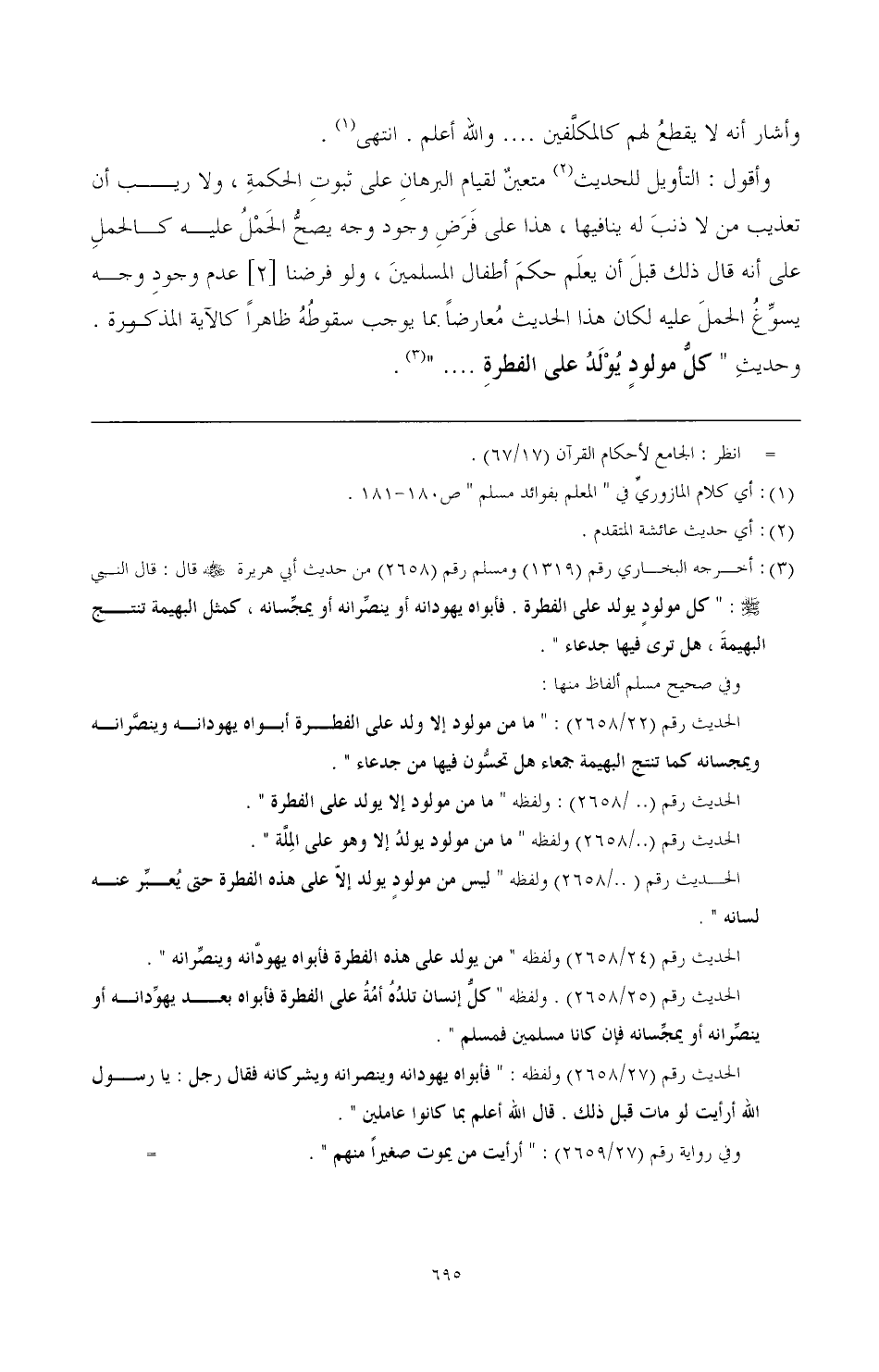 1/وهو الذي نختاره عليه أكثر العلماء أم المراد بالفطرة الطبع السليم المهيأ لقبول الدين وذلك من باب إطلاق القابل على المقبول.