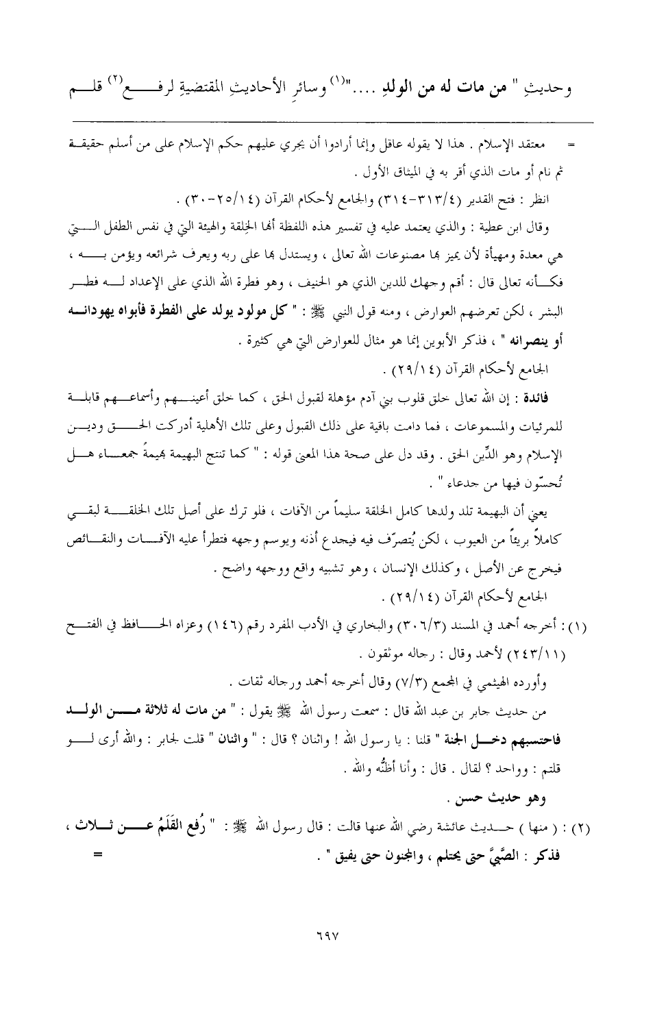 وحديث " من مات له من الولد .... " (¬1) وسائر الأحاديث المقتضية لرفع (¬2) قلم