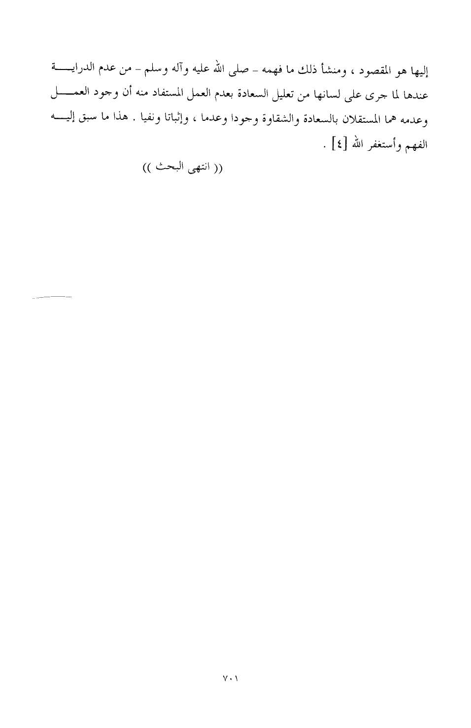 إليها هو المقصود، ومنشأ ذلك ما فهمه- صَلَّى اللهُ عَلَيْهِ وَآلِهِ وَسَلَّمَ- من عدم الدراية عندها لما جرى على لسانها من تعليل السعادة بعدم العمل المستفاد منه أن وجود العمل وعدمه هما المستقلان بالسعادة والشقاوة وجودا وعدما، وإثباتا ونفيا. هذا ما سبق إليه الفهم وأستغفر الله [4].