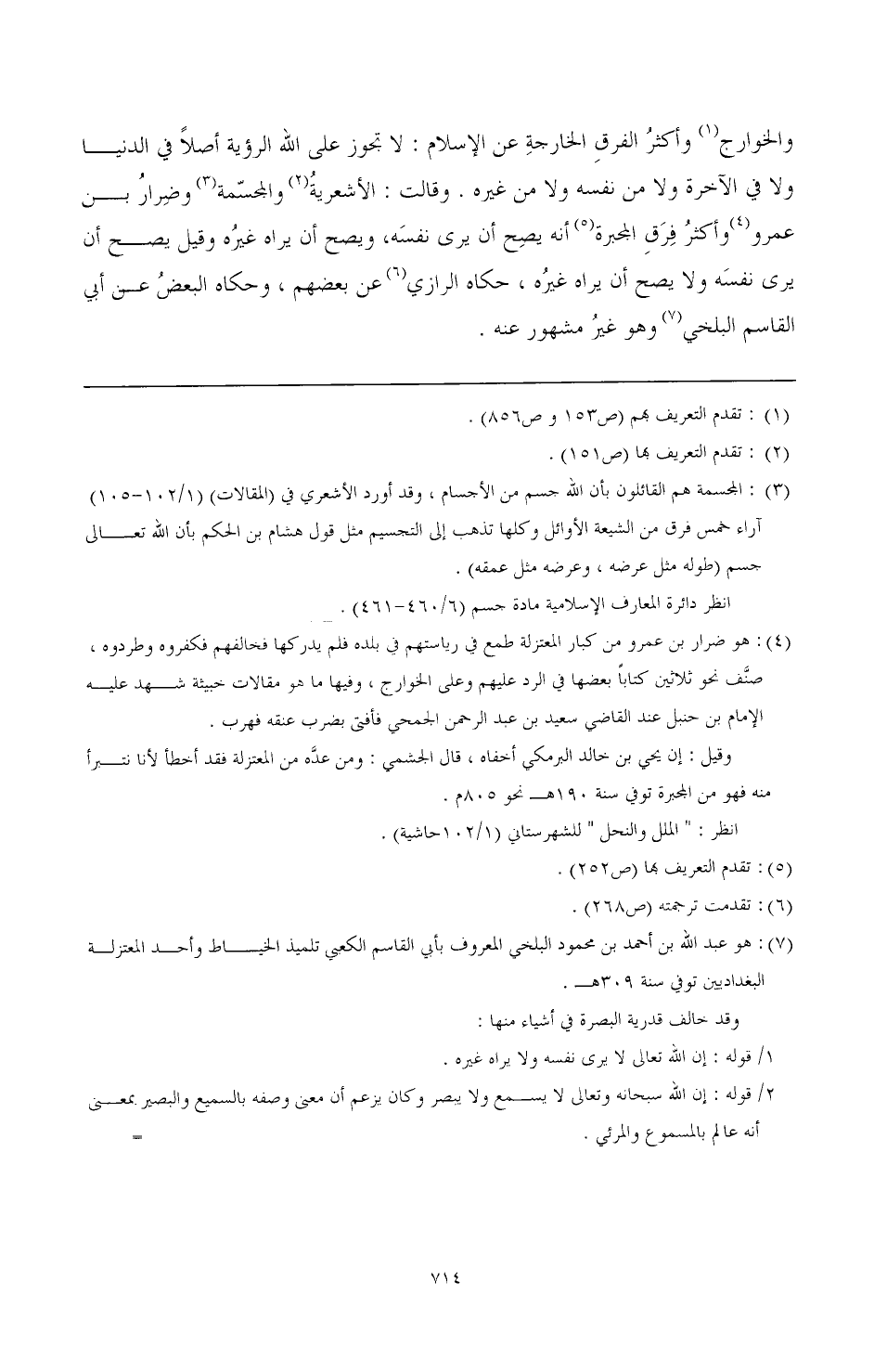 (¬7) هو عبد الله بن أحمد بن محمود البلخي المعروف بابي القاسم الكعبي تلميذ الخياط وأحد المعتزلة البغداديين توفي سنة 309 هـ.
