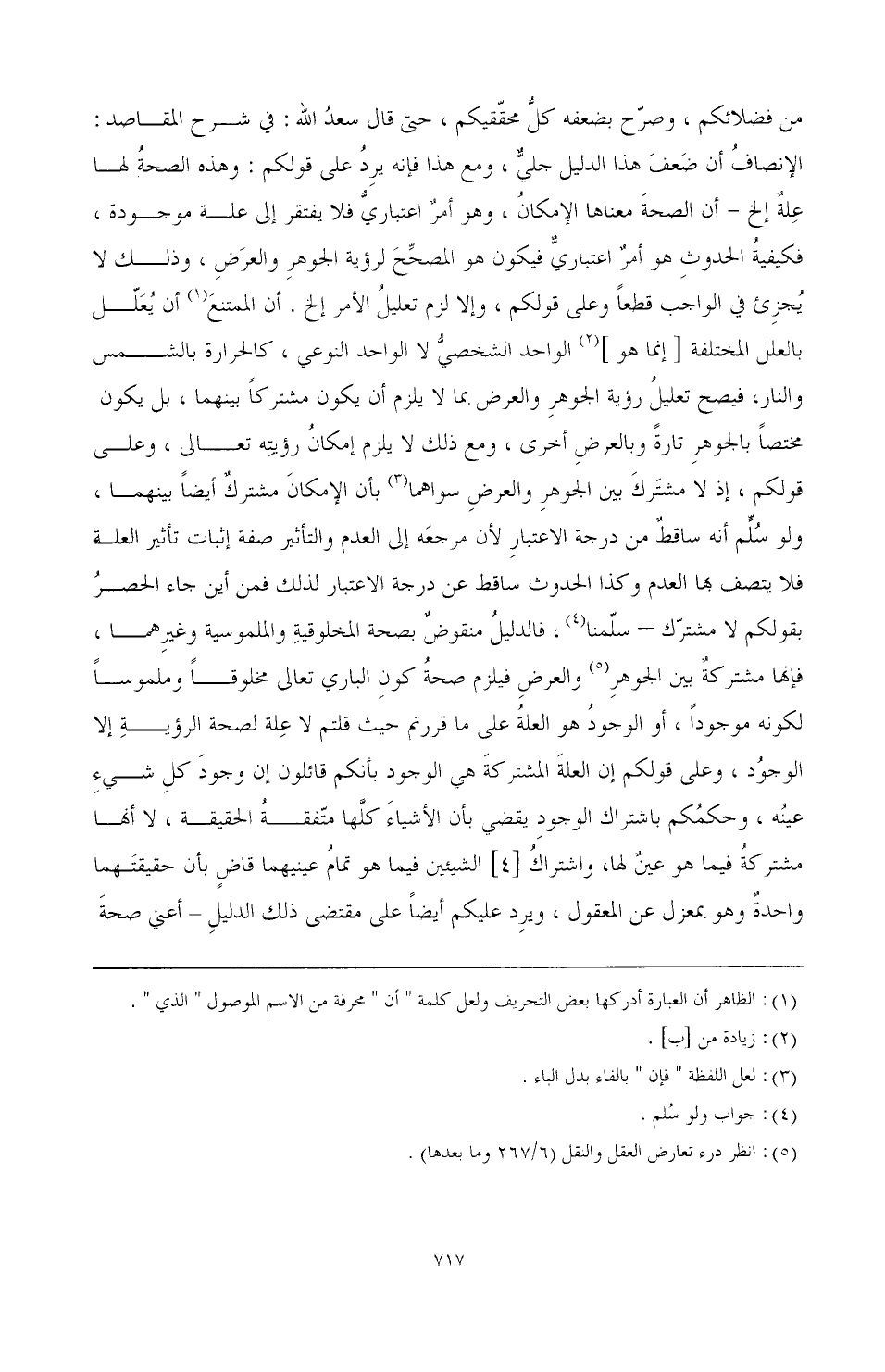 من فضلائكم، وصرح بضعفه كل محققيكم، حتى قال سعد الله: في شرح المقاصد: الإنصاف أن ضعف هذا الدليل جلط، ومع هذا فإنه يرد على قولكم ا: وهذه الصحة لها علة إلخ- أن الصحة معناها الإمكان، وهو أمر اعتباركم فلا يفتقر إلى علة موجودة، فكيفية الحدوث هو أمر اعتباري فيكون هو المصحح لرؤية الجوهر والعرض، وذلك لا يجزئ في الواجب قطعا وعلى قولكم، وإلا لزم تعليل الأمر الخ. أن الممتنع (¬1) أن يعلل بالعلل المختلفة إنما هو (¬2) الواحد الشخصي لا الواحد النوعي، كالحرارة بالذي، والنار، فيصح تعليل رؤية الجوهر والعرض. مما لا يلزم أن يكون مشتركا بينهما، بل يكون مختصا بالجوهر تارة وبالعرض أخرى، ومع ذلك لا يلزم إمكان رؤية تعالى، وعلى قولكم، إذ لا مشترك بين الجوهر والعرض سواهما (¬3) بأن الإمكان مشترك أيضًا بينهما، ولو سلم أنه ساقط من درجة الاعتبار لأن مرجعه إلى العدم والتأثير صفة إثبات تأثير العلة فلا يتصف ها العدم وكذا الحدوث ساقط عن درجة الاعتبار لذلك فمن أين جاء الحصر بقولكم لا مشترك- سلمنا (¬4)، فالدليل منقوض بصحة المخلوقية والملموسية وغيرهما، فإنا مشتركة بين الجوهر (¬5) والعرض فيلزم صحة كون الباري تعالى مخلوقا وملموسا لكونه موجودا، أو الوجود هو العلة على ما قررتم حيث قلتم لا علة لصحة الرؤية إلا الوجود، وعلى قولكم إن العلة المشتركة هي الوجود بأنكم قائلون إن وجود كل شيء عينه، وحكمكم باشتراك الوجود يقضى بأن الأشياء كفها متفقة الحقيقة، لا أنا مشتركة فيما هو على لها، واشتراك [4] الشيئيين فيما هو تمام عينيهما قاض بأن حية واحدة وهو. معزل عن المعقول، ويرد عليكم أيضًا على مقتضى ذلك الدليل- أعني صحة