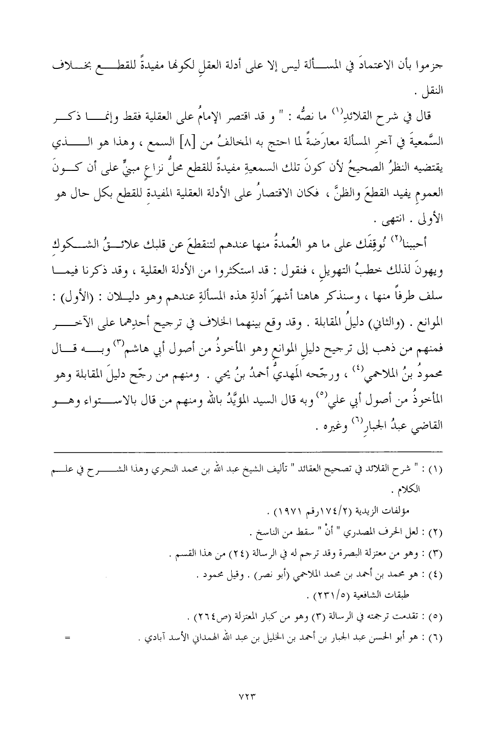 أحببنا (¬2) نوقفك على ما هو العمدة منها عندهم لتنقطع عن قلبك علائق الشكوك يهون لذلك خطب التهويل، فنقول: قد استكثروا من الأدلة العقلية، وقد ذكرنا فيما سلف طرفا منها، وسنذكر هاهنا أشهر أدلة هذه المسألة عندهم وهو دليلان: (الأول): الموانع. (والثاني) دليل المقابلة. وقد وقع بينهما الخلاف في ترجيح أحدهما على الآخر فمنهم من ذهب إلى ترجيح دليل الموانع وهو المأخوذ من أصول أبي هاشم (3) وبه قال محمود بن الملاحمي (¬3)، ورجحه المهدي أحمد بن يحط. ومنهم من رجح دليل المقابلة وهو المأخوذ من أصول أبي علي (¬4) وهو من معتزلة البصرة وقد ترجم له في الرسالة (24) من هذا القسم. (¬5) وبه قال السيد المؤيد بالله ومنهم من قال بالاستواء وهو القاضي عبد الجبار (¬6) وغيره.