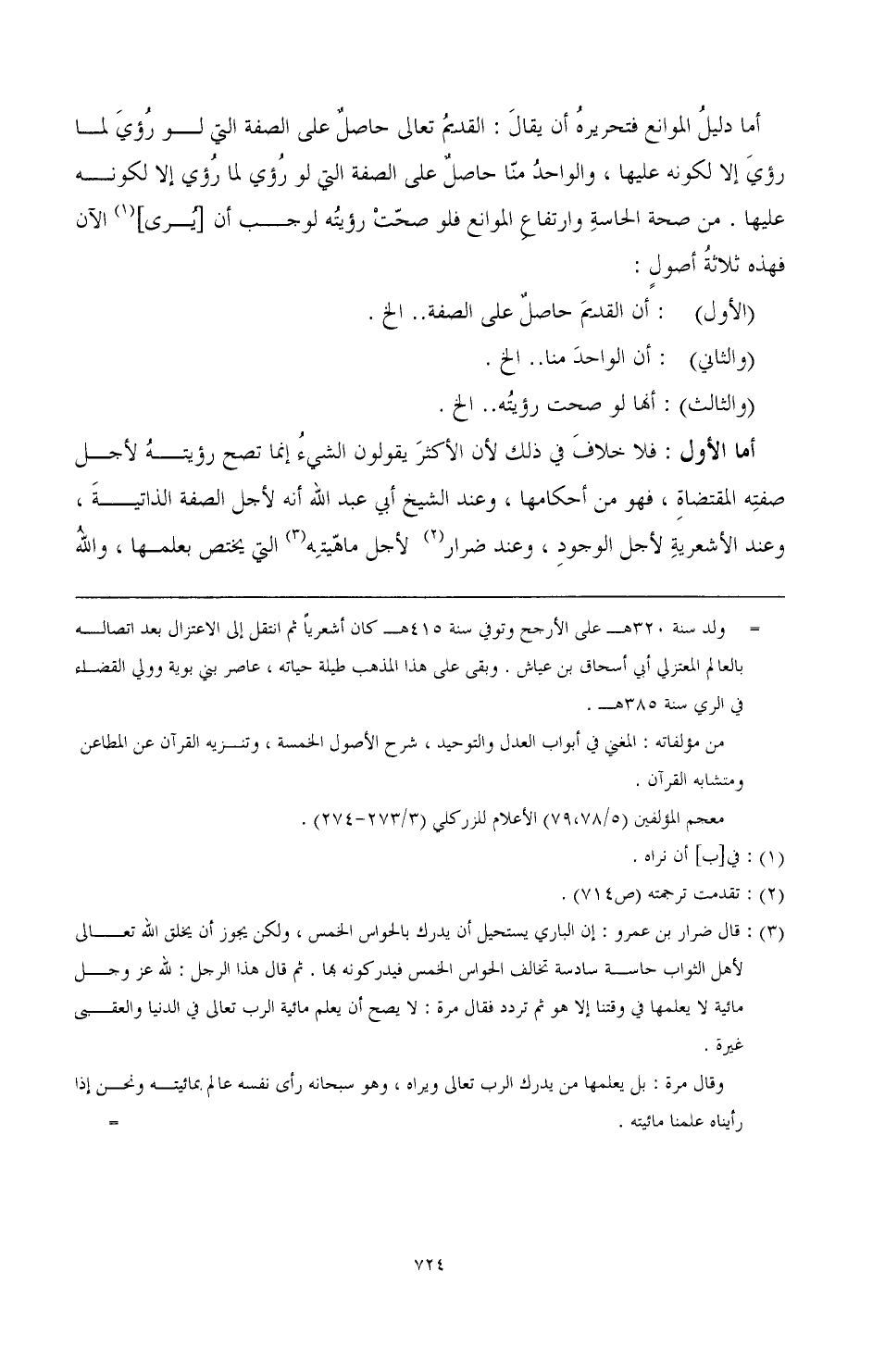 أما الأول: فلا خلاف في ذلك لأن الأكثر يقولون الشيء إنما تصح رؤيته لأجل صفته المقتضاه، فهو من أحكامها، وعند الشيخ أبي عبد الله أنه لأجل الصفة الذاتية، وعند الأشعريه لأجل الوجود، وعند ضرار (¬2) لأجل ماهيته (¬3) التي يختص بعلمها، والله
